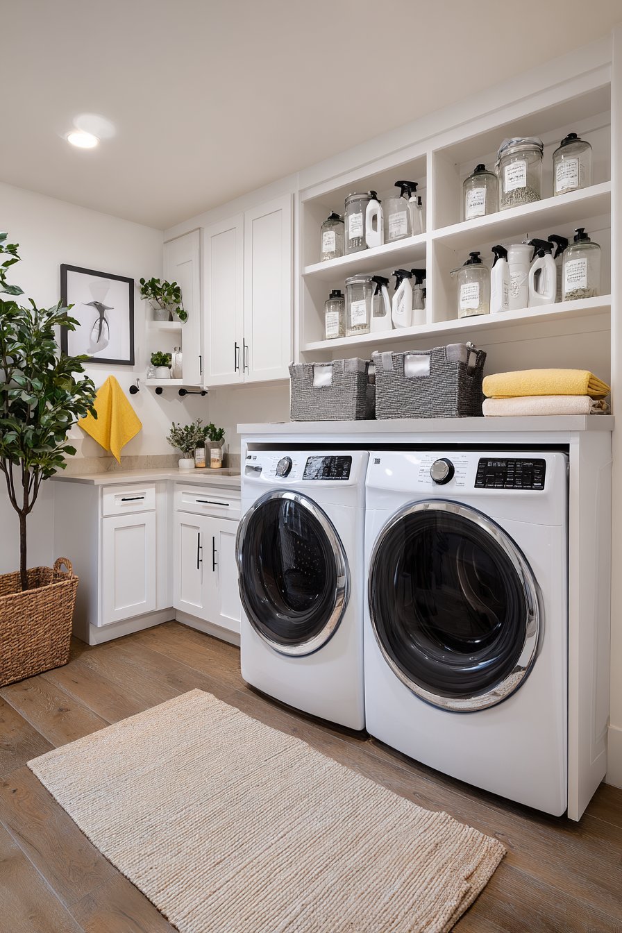 A laundry room without adequate storage quickly becomes chaotic. Detergent bottles, fabric softener, dryer sheets, stain removers, and sorting baskets all need a home. Purposeful storage design keeps everything accessible without creating visual clutter.