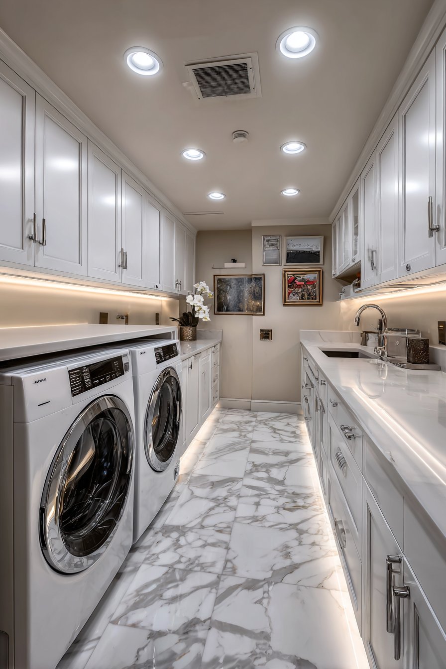 Ceramic or porcelain tile is the gold standard for laundry room floors. It is completely waterproof, durable, and available in a wide range of styles and sizes. Large format tiles (18×18 or larger) minimize grout lines, making cleaning faster and more effective. Non-slip finishes are a smart choice in any wet environment.