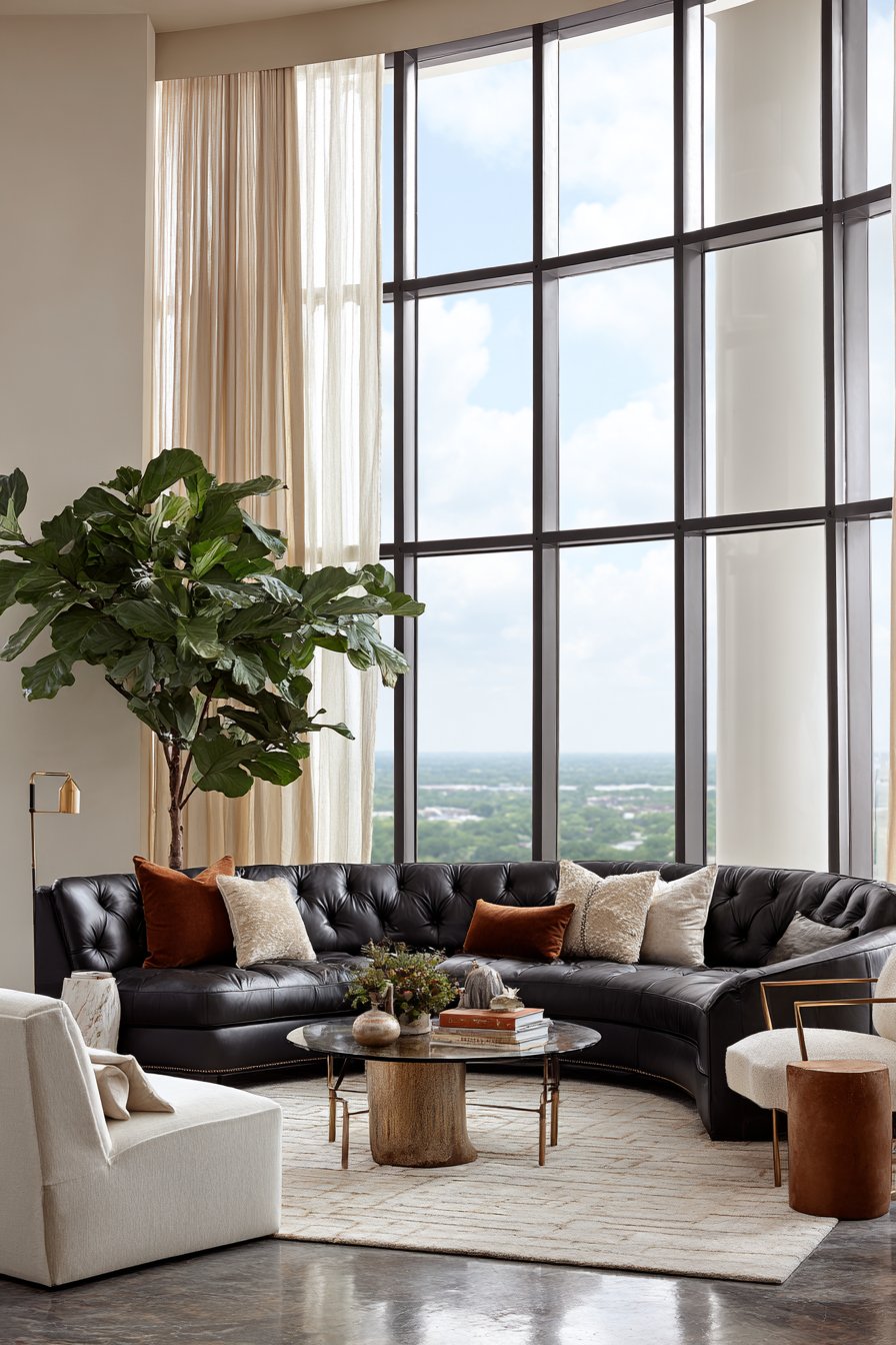 Choose chairs with exposed legs in materials like brass, chrome, or light wood to introduce visual lightness into the arrangement. This contrast helps break up the solid mass of a black sectional while maintaining design cohesion. Position accent chairs at angles to the sectional rather than parallel to soften the geometric lines and create more dynamic visual interest.