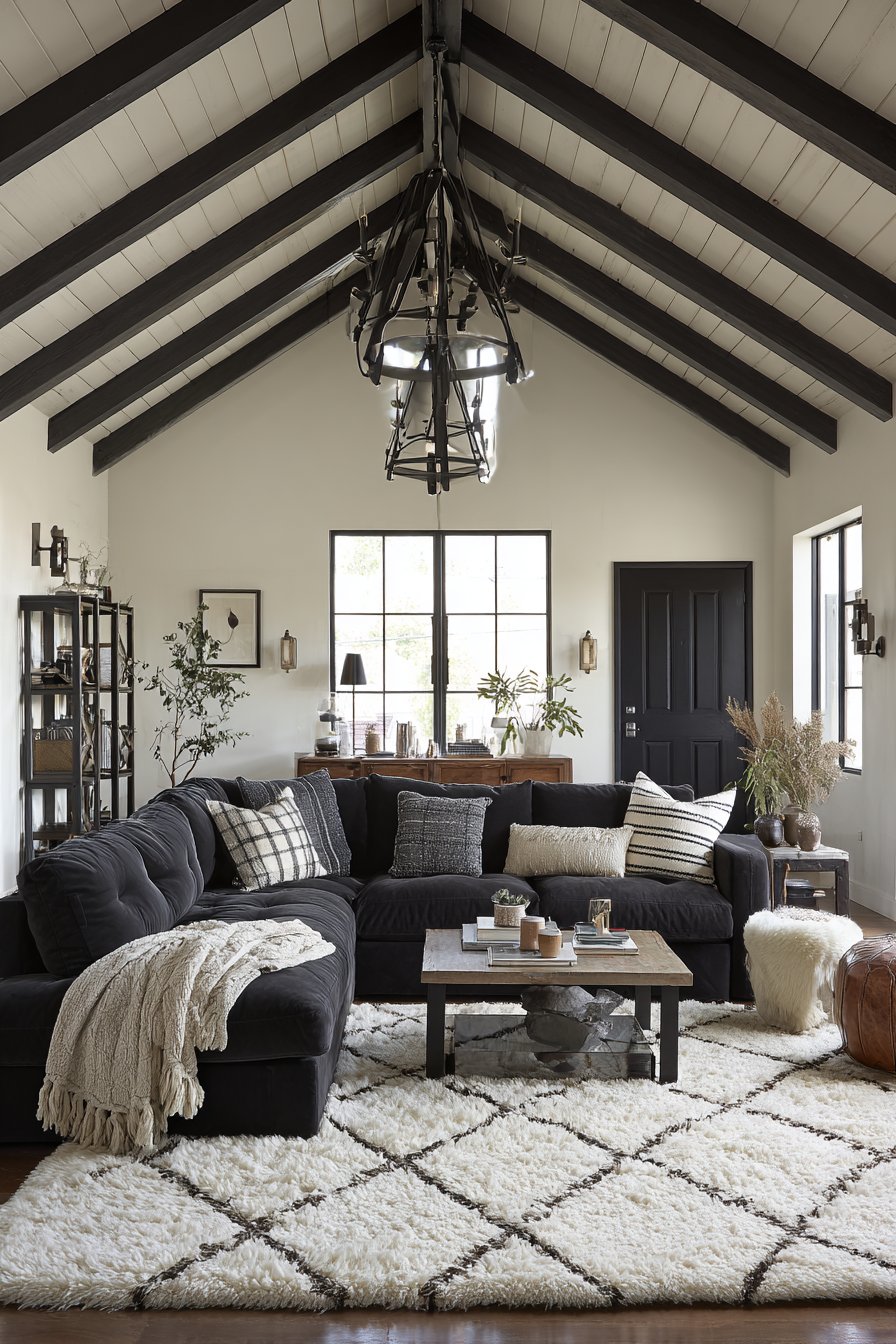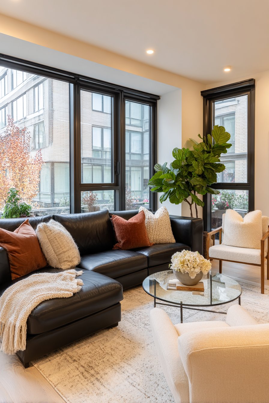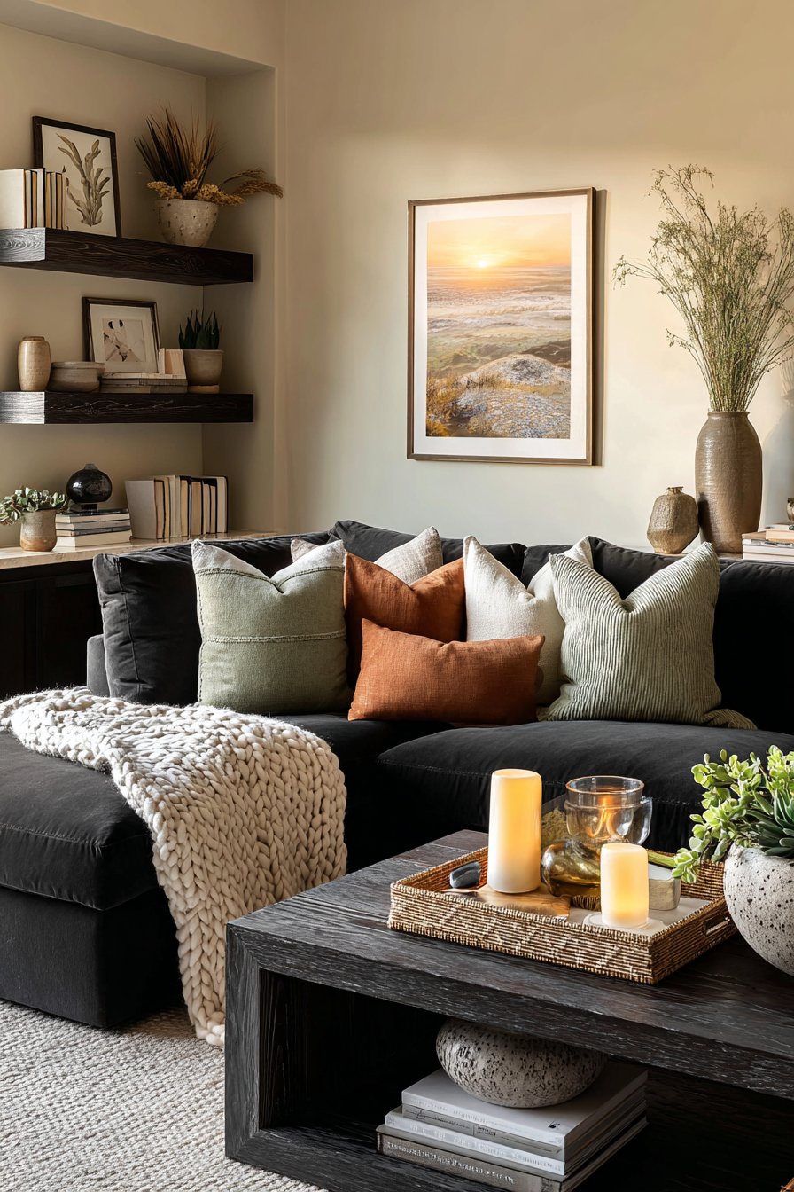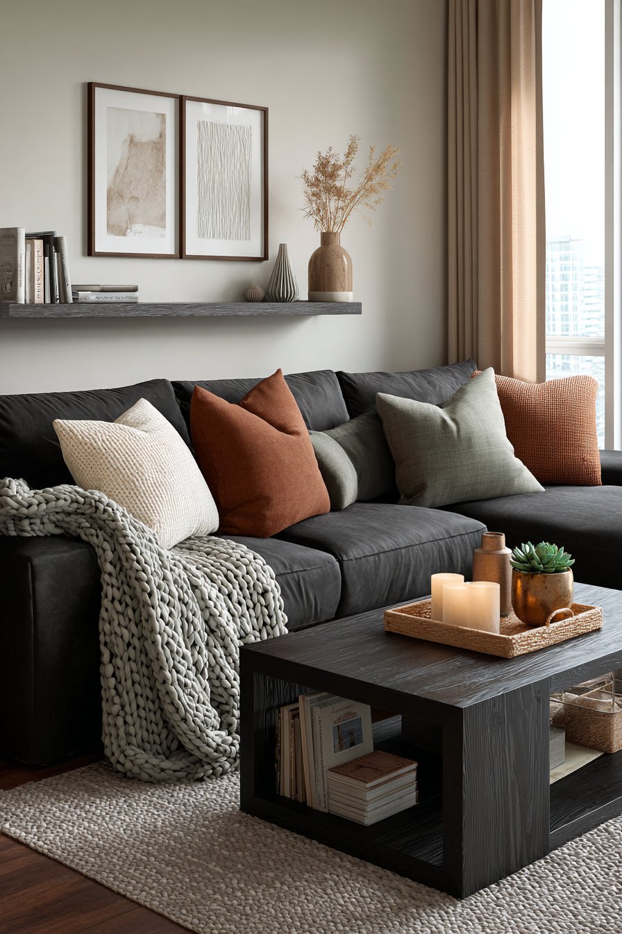 Drape a textured throw blanket over one arm or the back of the sectional for both functional warmth and decorative appeal. Choose materials like chunky knit, faux fur, or woven cotton in colors that complement your overall scheme. This simple addition softens the black upholstery while adding a layer of coziness that invites relaxation.