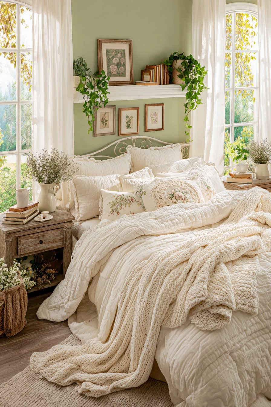 Cottagecore bedrooms rely on gentle, earthy color schemes that mirror natural landscapes rather than bold, stimulating hues. Cream, sage green, dusty rose, and warm beige dominate these spaces. These colors create visual harmony that allows the mind to rest without overstimulation.