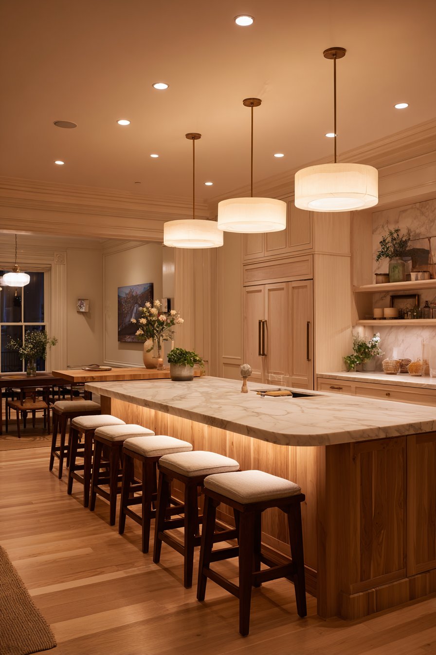 Kitchen islands with seating serve dual purposes, facilitating food preparation while keeping cooks connected to family. Counter-height seating allows children to help with cooking or complete homework nearby. These multi-functional zones maximize the kitchen’s role as a gathering hub.