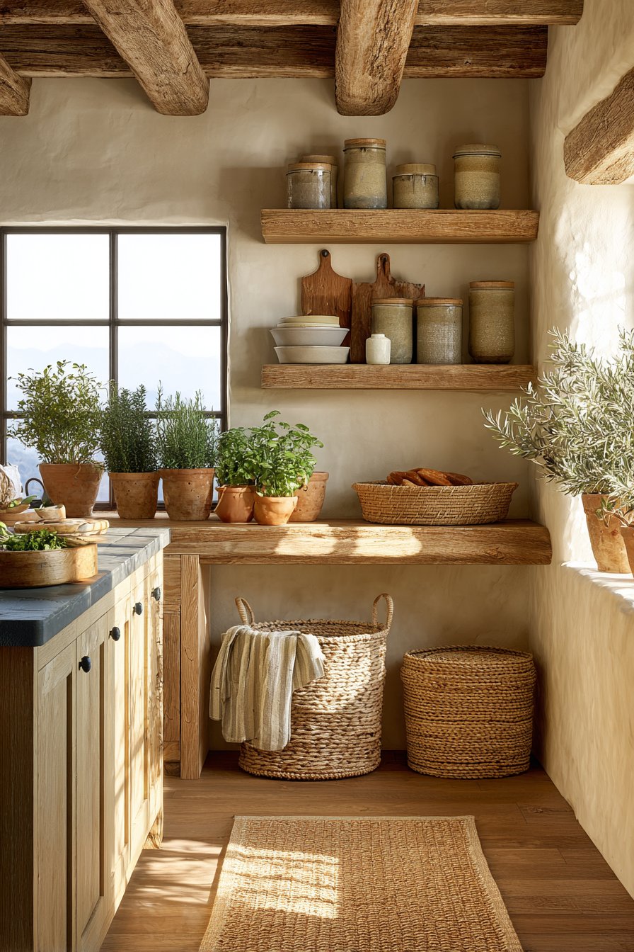 Woven baskets provide functional storage while adding textural variety to shelves and countertops. Natural fiber rugs cushion feet during long cooking sessions and define specific zones. Stone or ceramic elements contribute weight and permanence that ground the space visually.