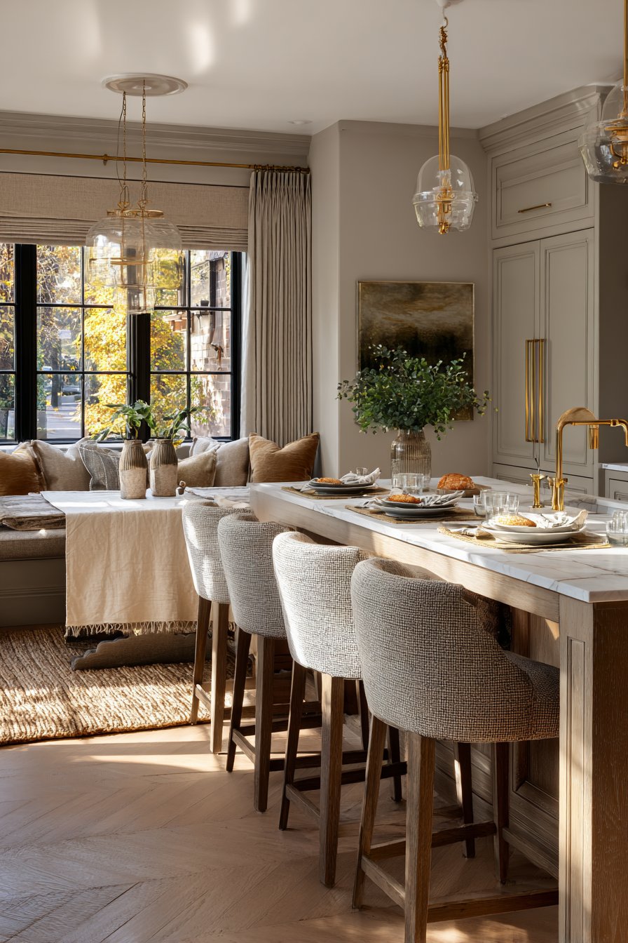 - Choose upholstered or cushioned seating for kitchen islands and dining spaces