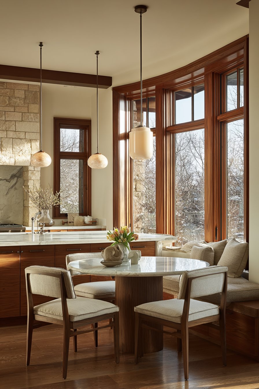 Dedicated gathering areas within the kitchen encourage social connection and extended time in the space. A small breakfast nook with a round table creates intimacy that larger dining setups cannot achieve. Window seats with cushions provide cozy spots for morning coffee or casual conversations.