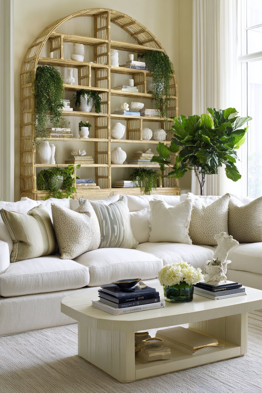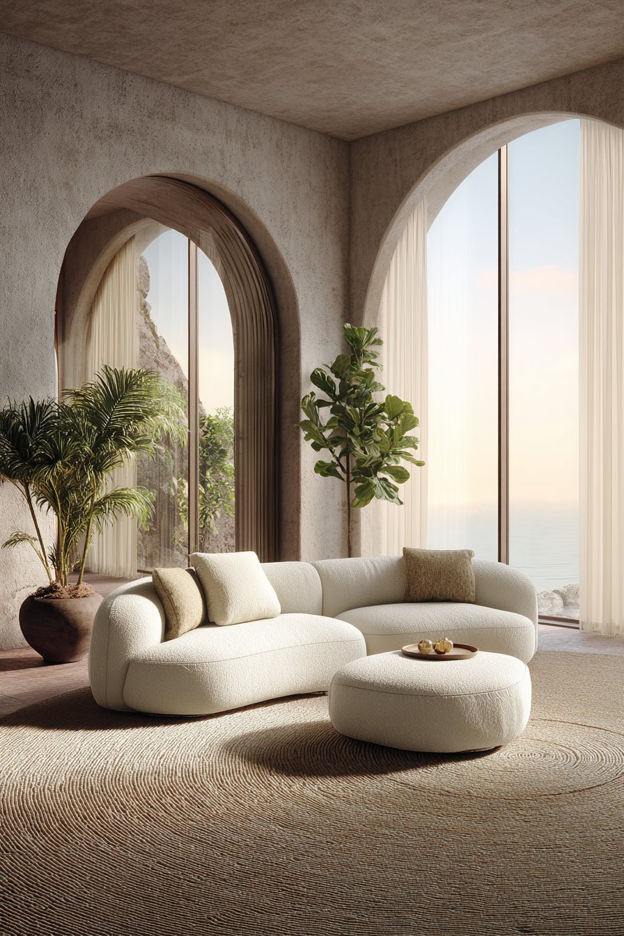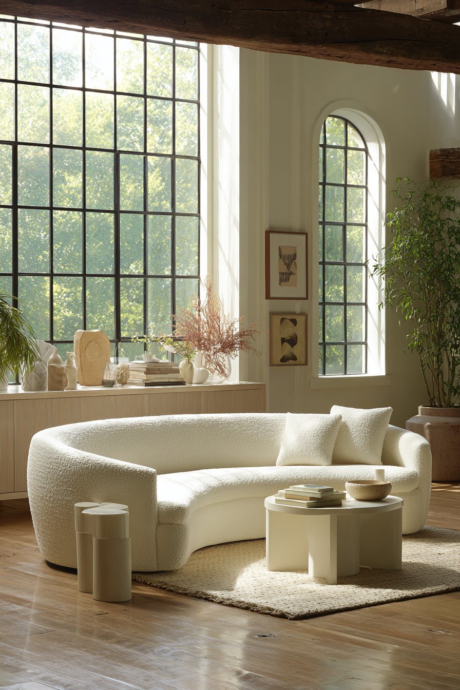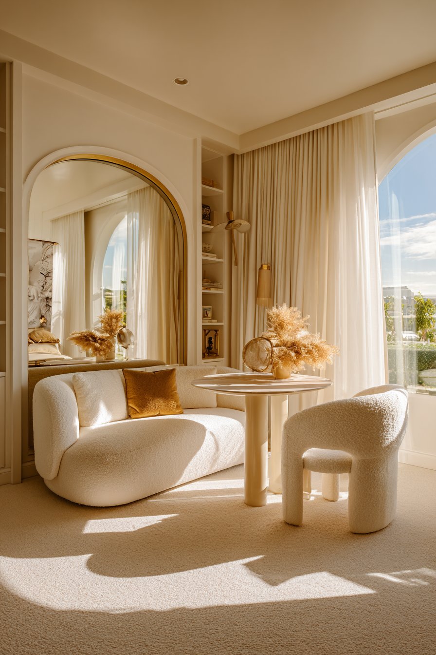 - Build a base palette of warm neutrals — cream, sand, and camel — around curved pieces