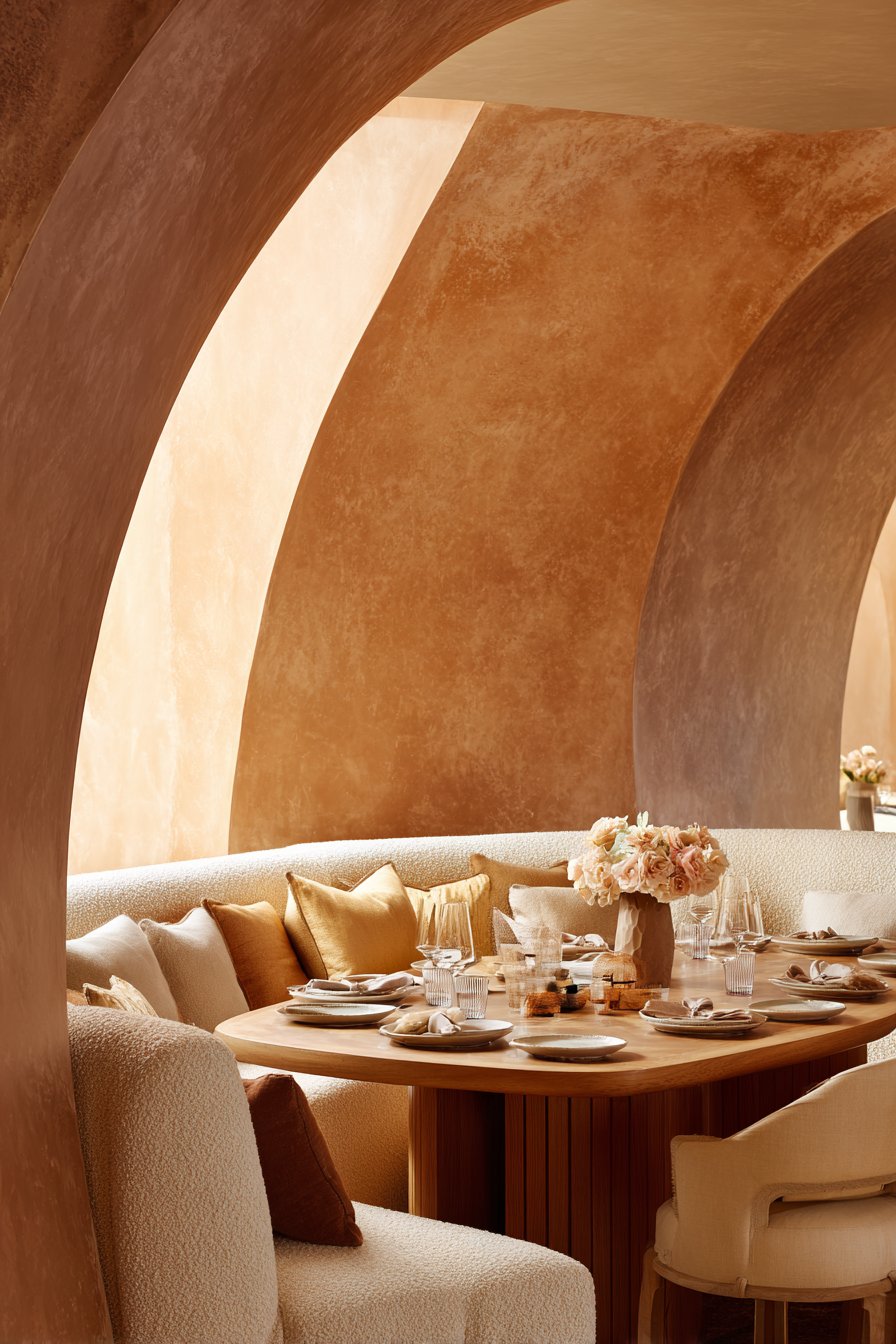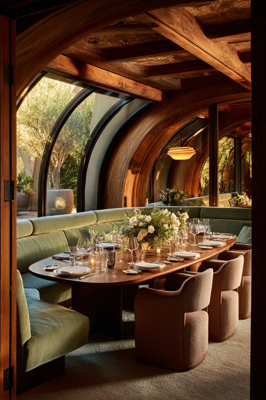 Curved dining furniture is another major trend reshaping modern interiors. Round dining tables have always had a place in design, but now curved-back chairs, oval tables, and arched banquettes are joining them to create fully fluid dining environments. The result is a dining experience that feels more communal and convivial — no head of the table, no hierarchy, just connection.
