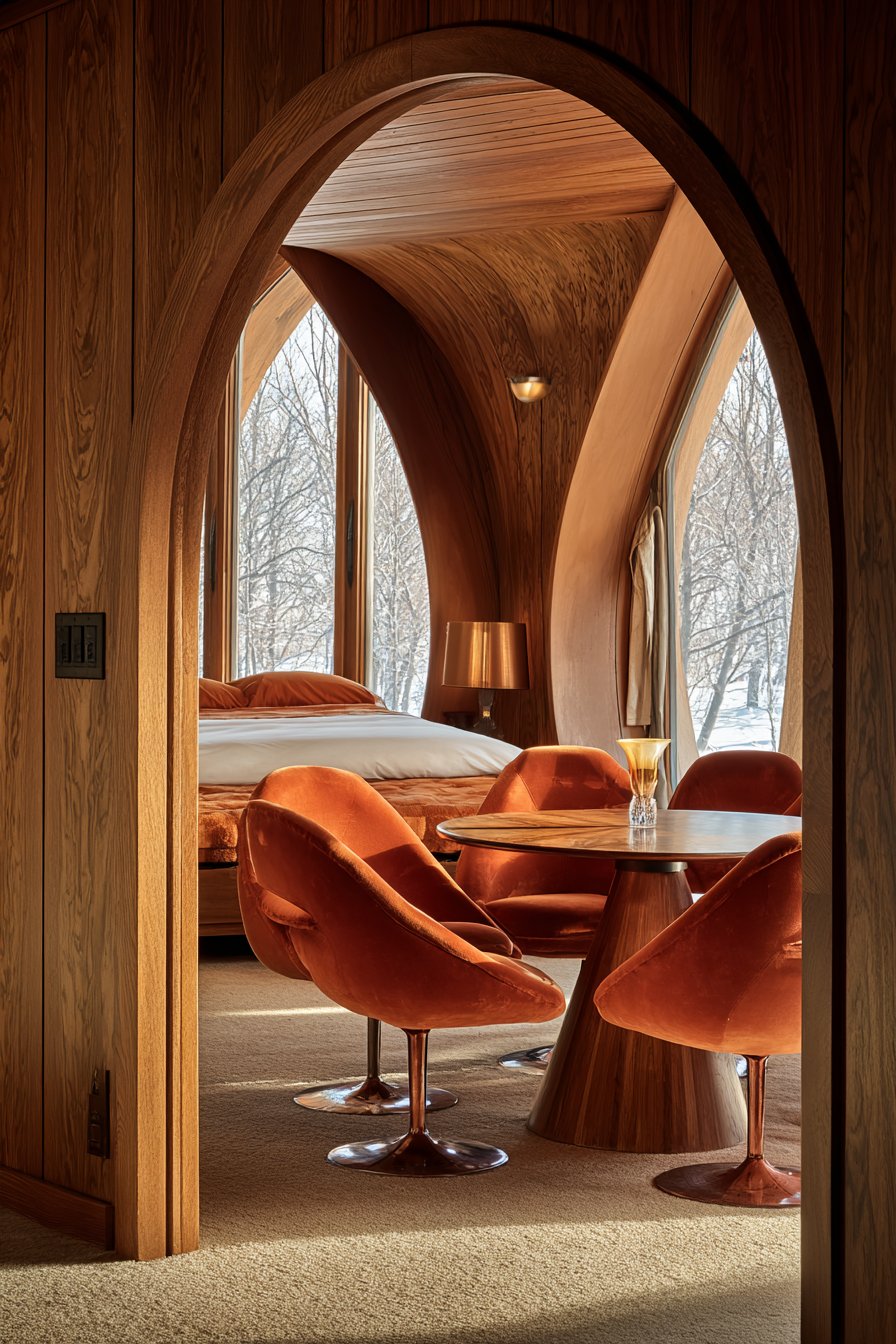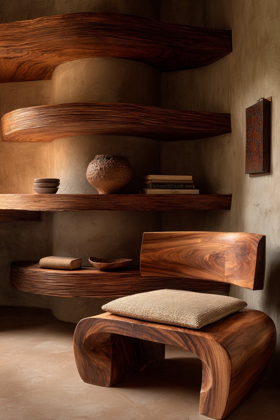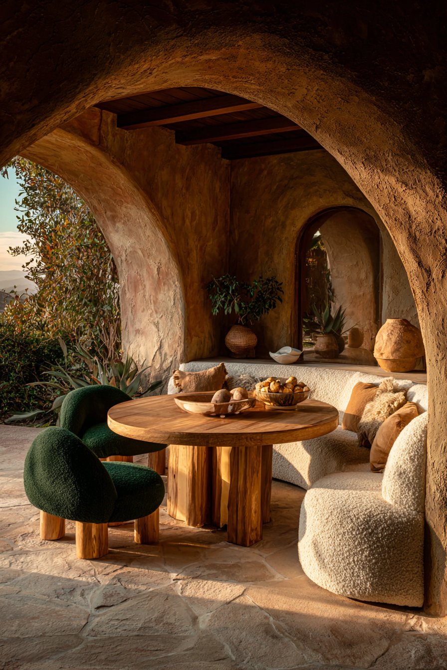 - Use sage green or terracotta walls to complement natural, curved wood furniture