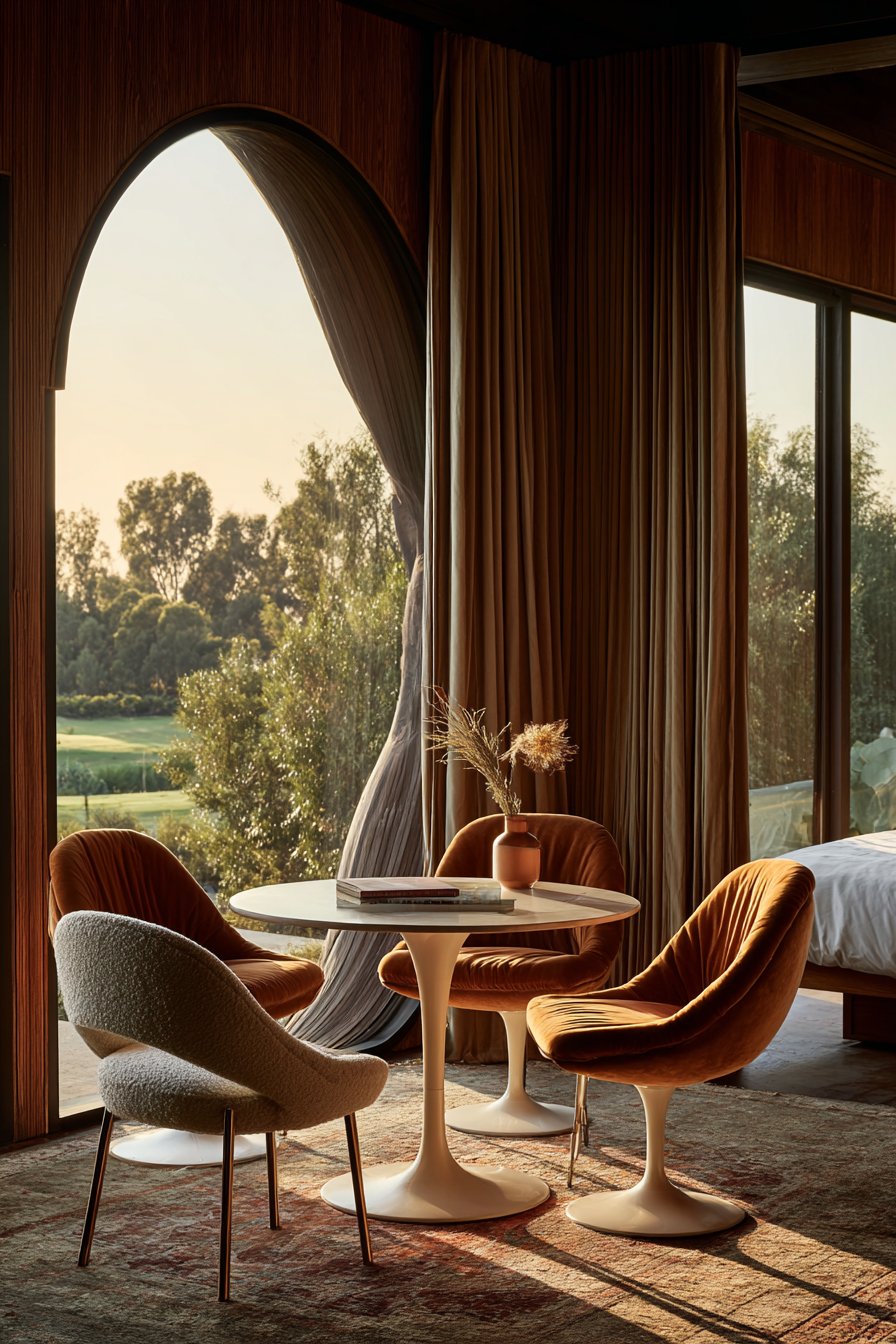 - Reference Mid-Century Modern icons with tulip-style dining chairs