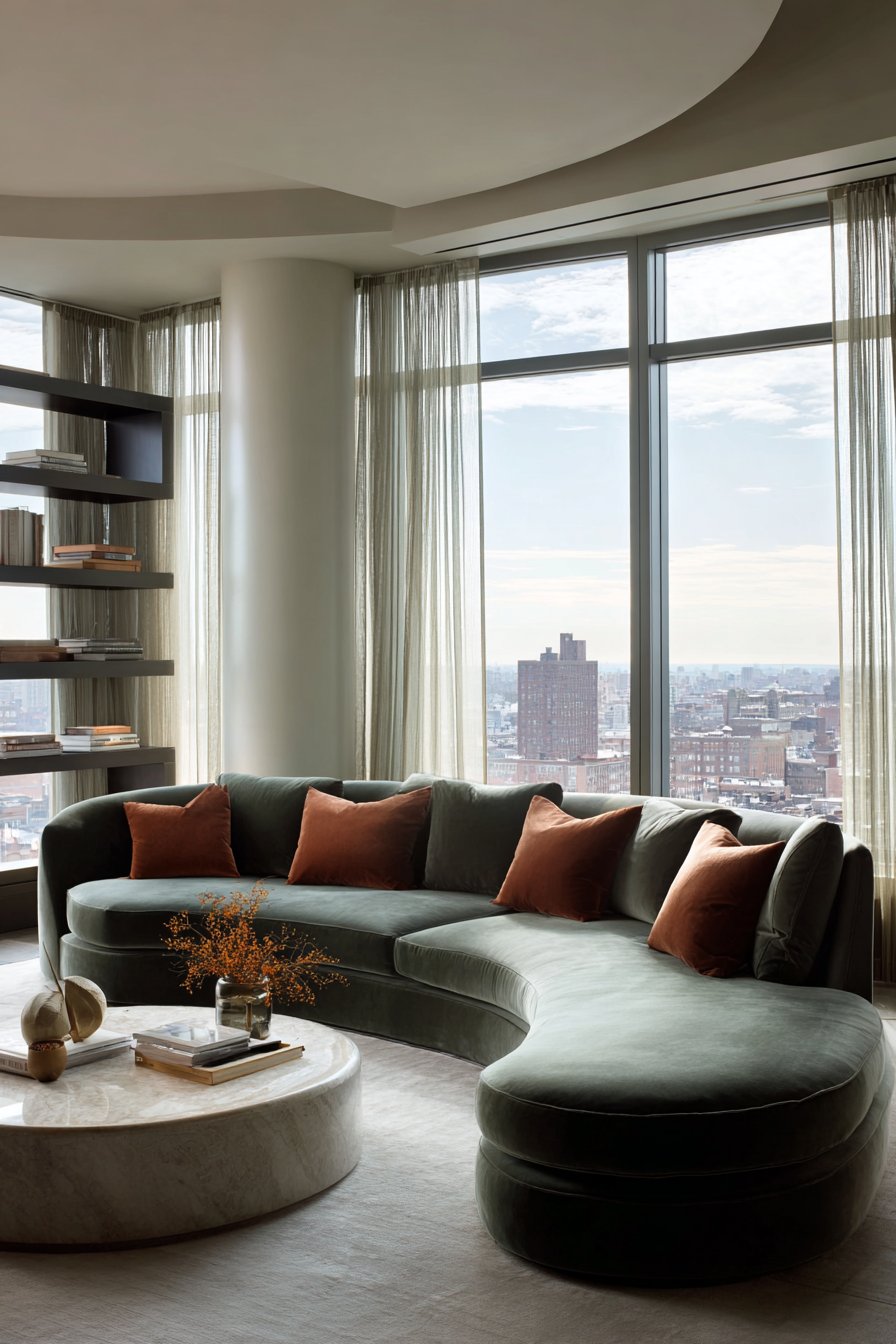 A curved sofa works especially well in open-plan spaces where it can float in the center of the room and define a seating zone without the need for walls. Its rounded back creates a natural sense of enclosure, making the seating area feel intimate even in a large, open room. This is a design trick interior designers have used for years to create coziness in expansive spaces.