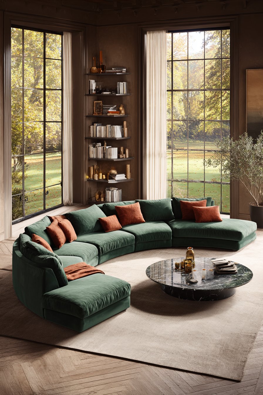 - Choose a crescent or semi-circular sectional for open-plan living areas