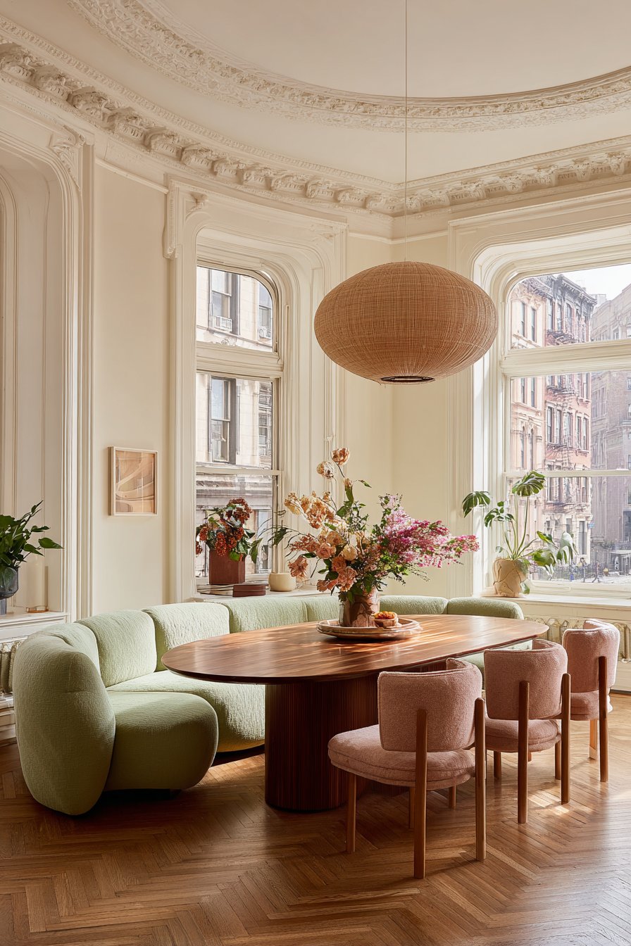 Oval and round tables are particularly effective in smaller dining rooms. They maximize seating capacity without the awkward corners of a rectangular table cutting into circulation paths. Curved banquette seating built into a corner can transform an underused space into one of the most beloved spots in the home.