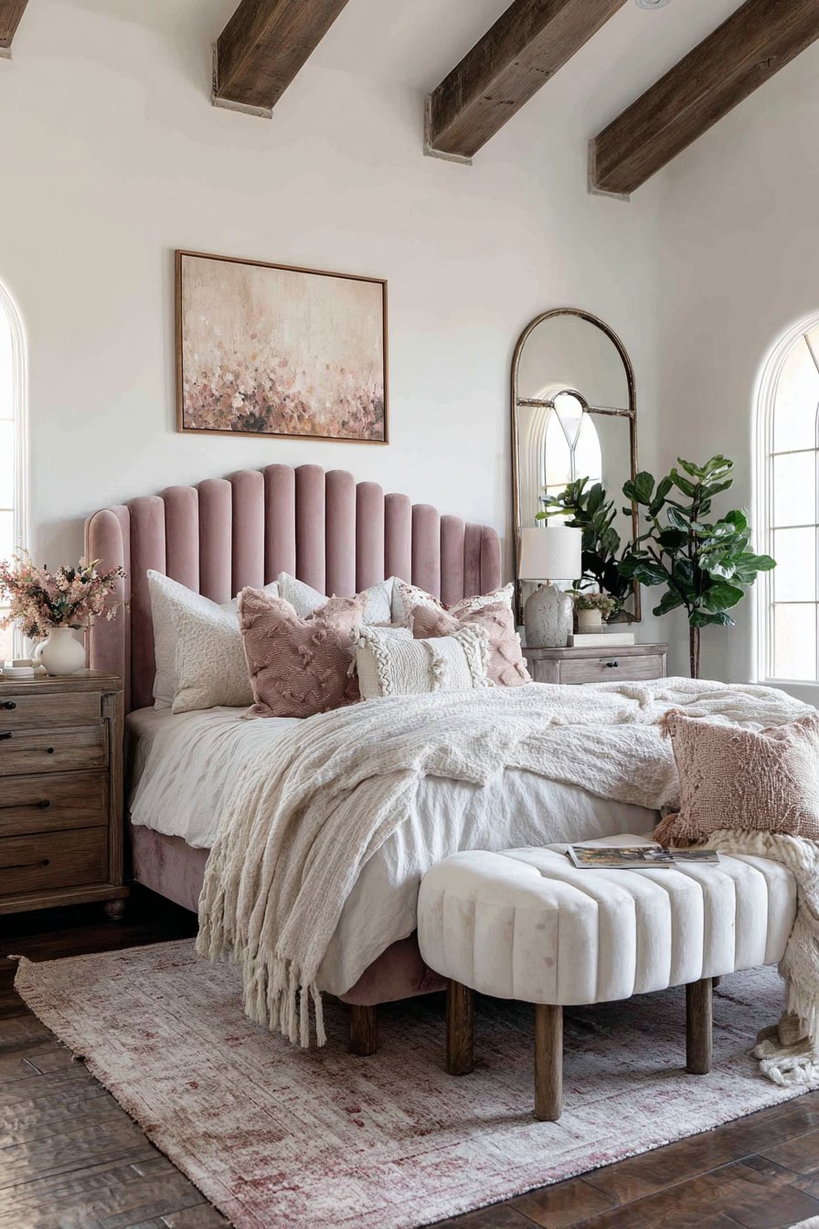 - Use a rounded bedroom bench at the foot of the bed for a polished look