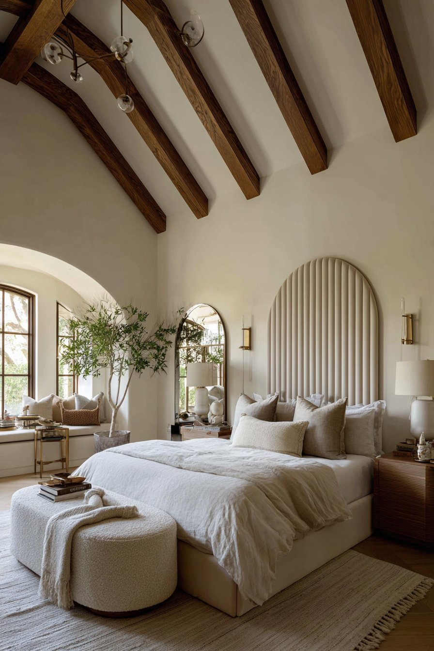A curved headboard instantly becomes the focal point of the bedroom. It draws the eye upward and creates a sculptural quality that flat or rectangular headboards simply cannot achieve. Whether upholstered in velvet, linen, or leather, an arched headboard adds drama and elegance in equal measure. It works beautifully with organic, Japandi, and maximalist design styles alike.