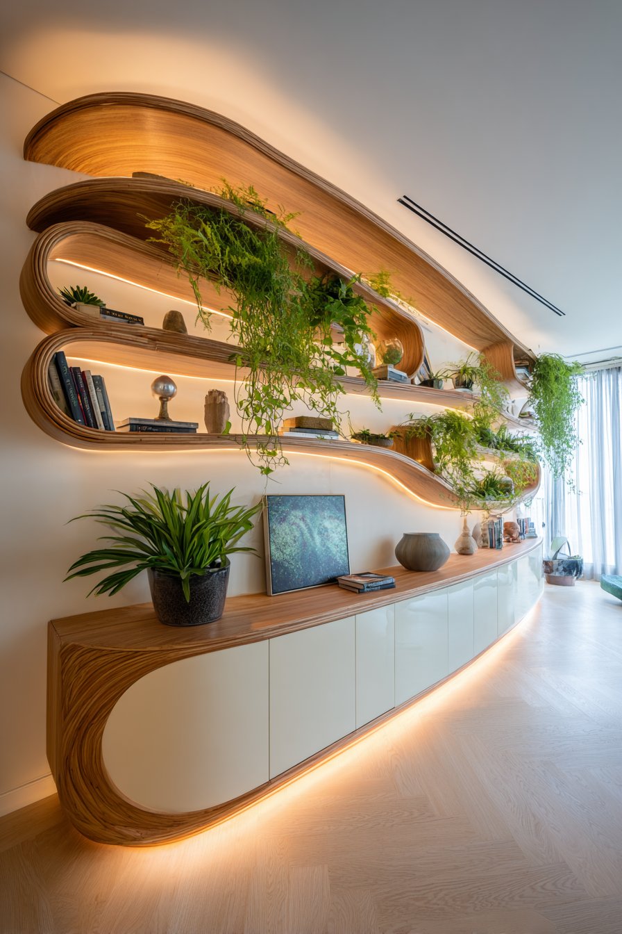 Curved bookshelves and display units create a sense of movement and flow along a wall. Rather than dividing a space rigidly, they soften vertical surfaces and give the eye a more interesting journey. In living rooms, they can serve as stunning backdrops for displaying art, books, and decorative objects. In home offices, they bring an unexpected touch of elegance to a typically functional space.