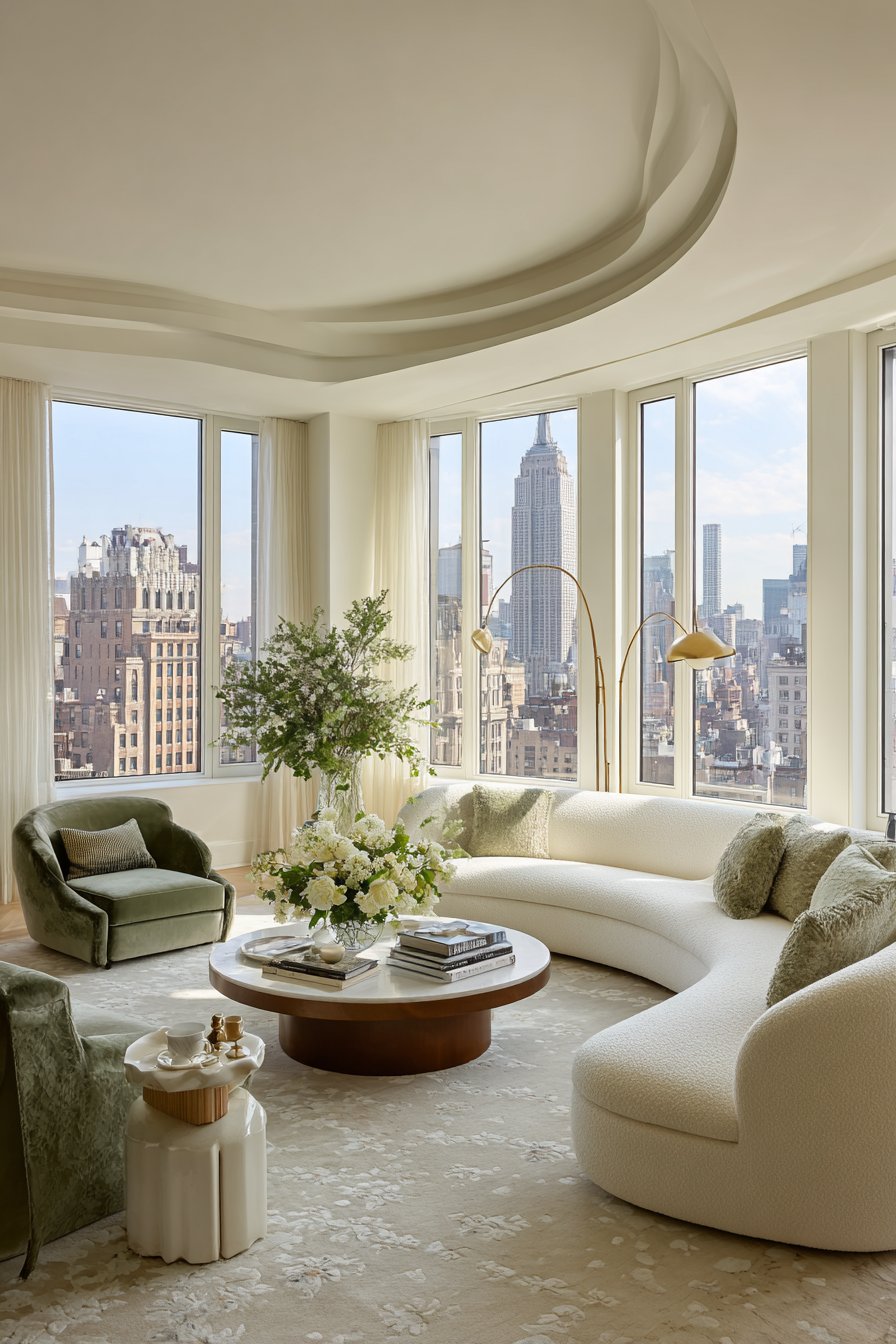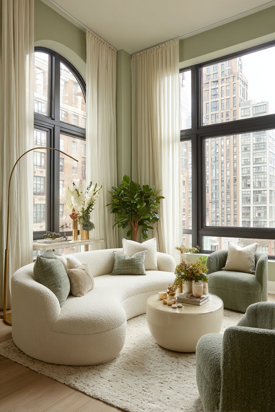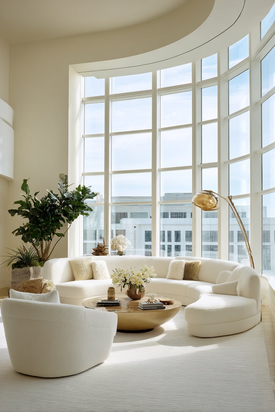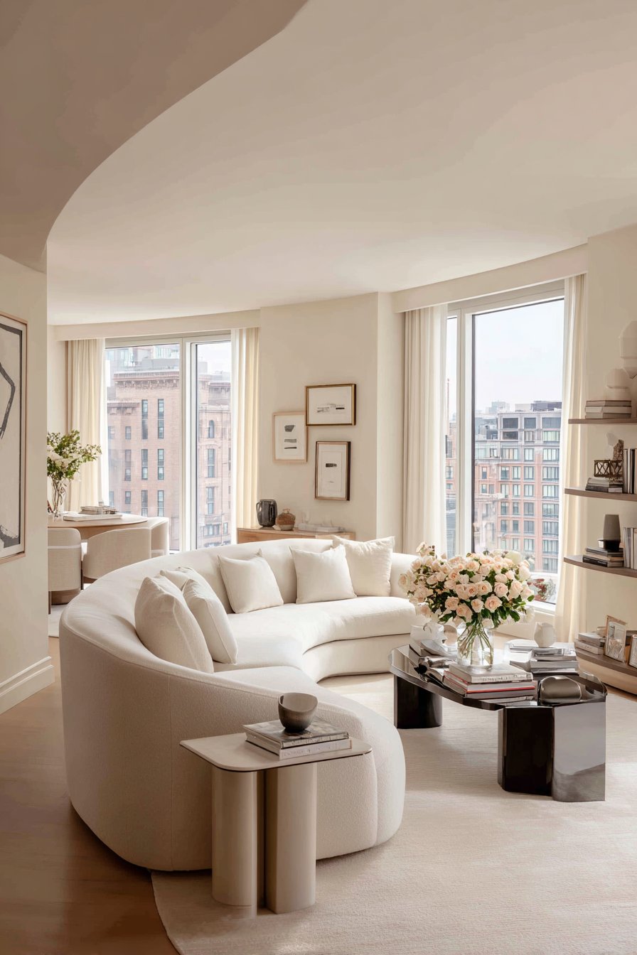 For a softer, more understated look, neutral and tonal palettes work beautifully. Cream-on-cream, ivory, and off-white curved pieces create an atmosphere of serene luxury. Layer different textures within the same neutral palette to prevent the look from feeling flat or monotonous.