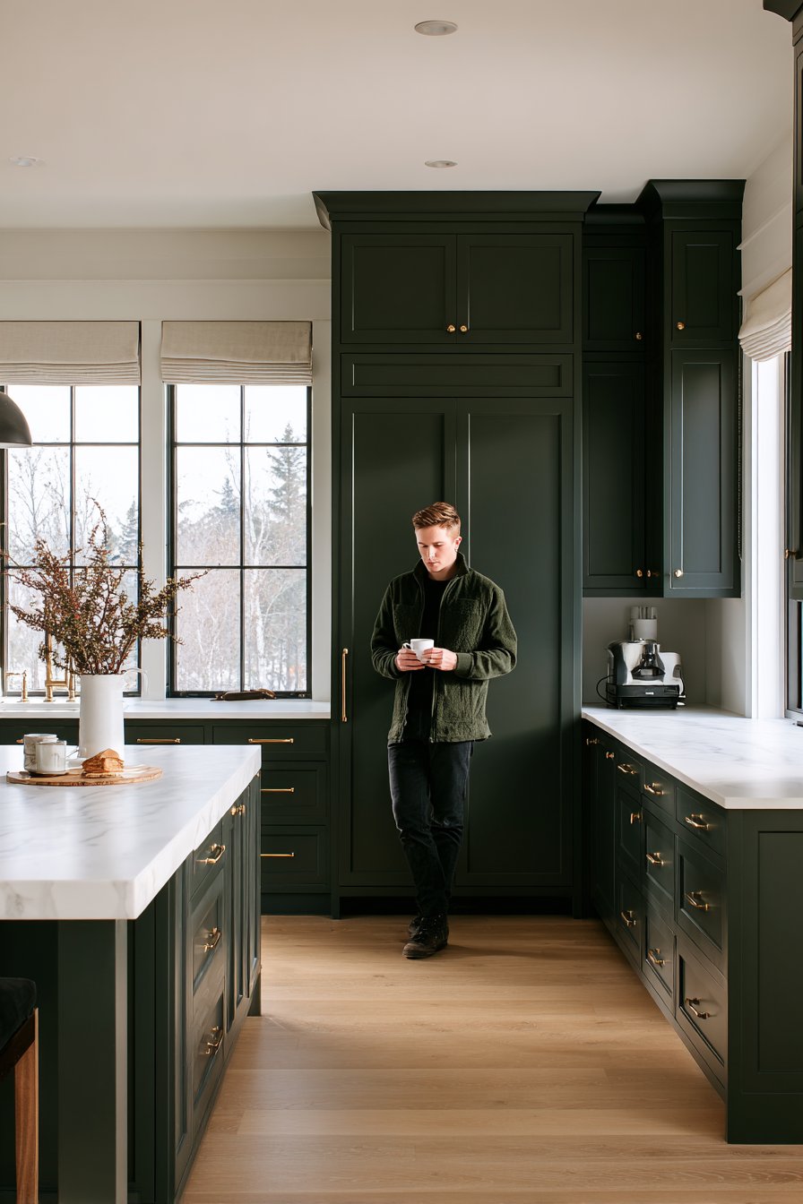 Island treatments demonstrate dark green’s focal point potential. A bold green island surrounded by neutral perimeter cabinets creates dramatic centerpieces. Waterfall edge islands in contrasting marble emphasize contemporary luxury. These islands become gathering spaces that anchor kitchen designs.