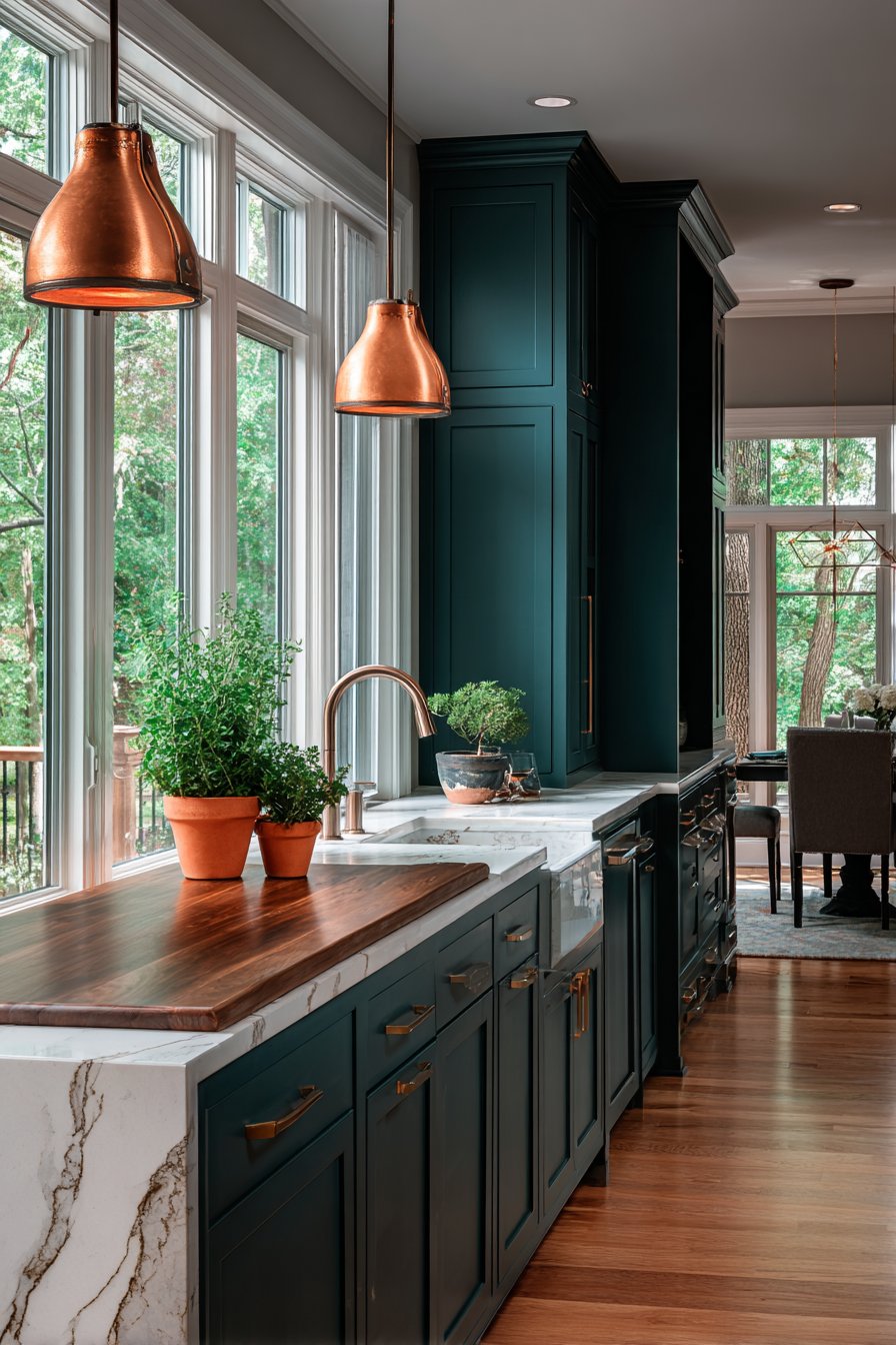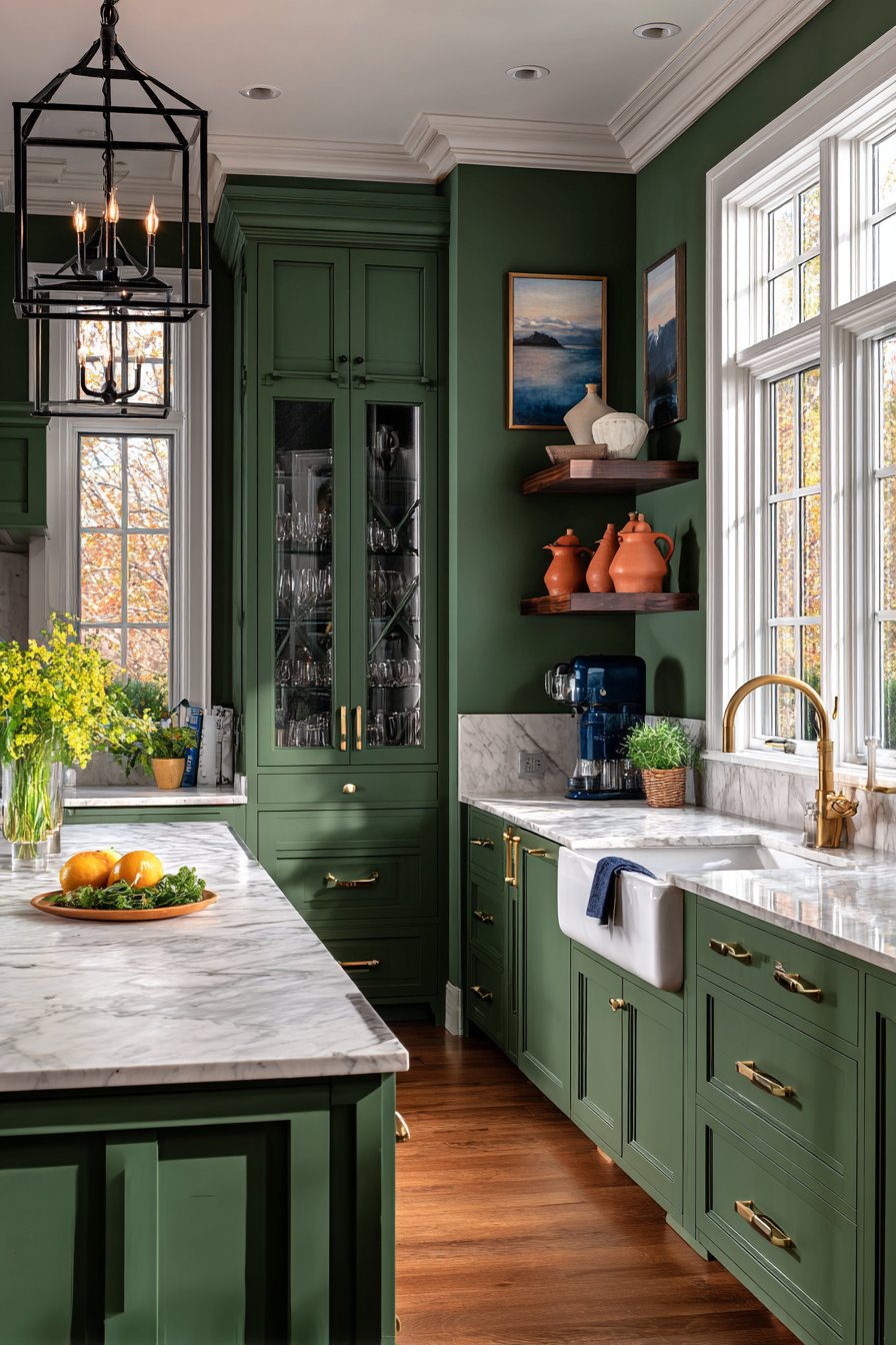 Accent colors gain new dimension against dark green backgrounds. Crisp white trim, terracotta accessories, or navy blue accents all pop without overwhelming the space. This versatility means you can refresh your kitchen’s personality through affordable decor changes rather than expensive renovations.