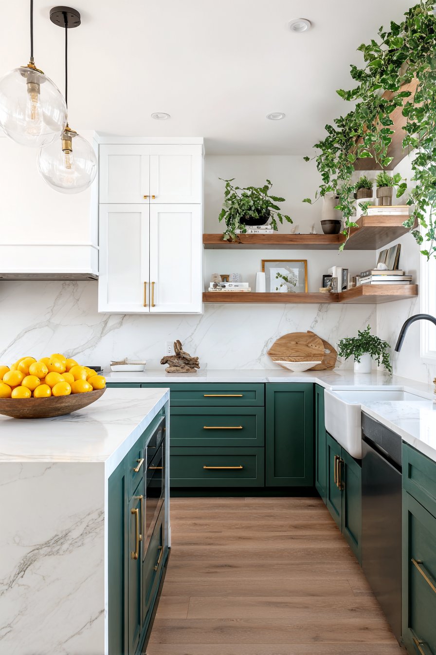 - Consider lighter green or white for upper cabinets to maintain brightness