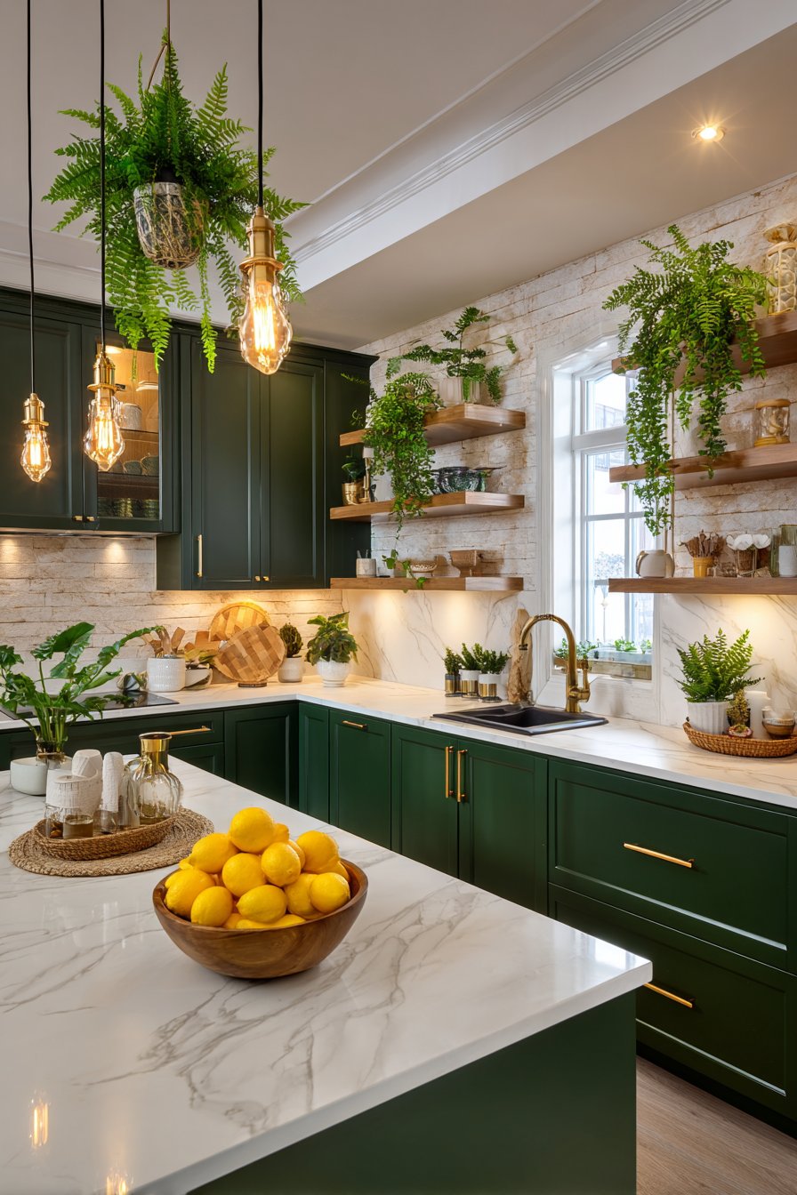 Dark green creates an immediate sense of tranquility and grounding in kitchen environments. Unlike bright whites that can feel clinical or cold grays that sometimes appear sterile, green connects us to nature’s calming influence. This color triggers our innate biophilic response, making kitchens feel like restorative retreats rather than purely functional workspaces.