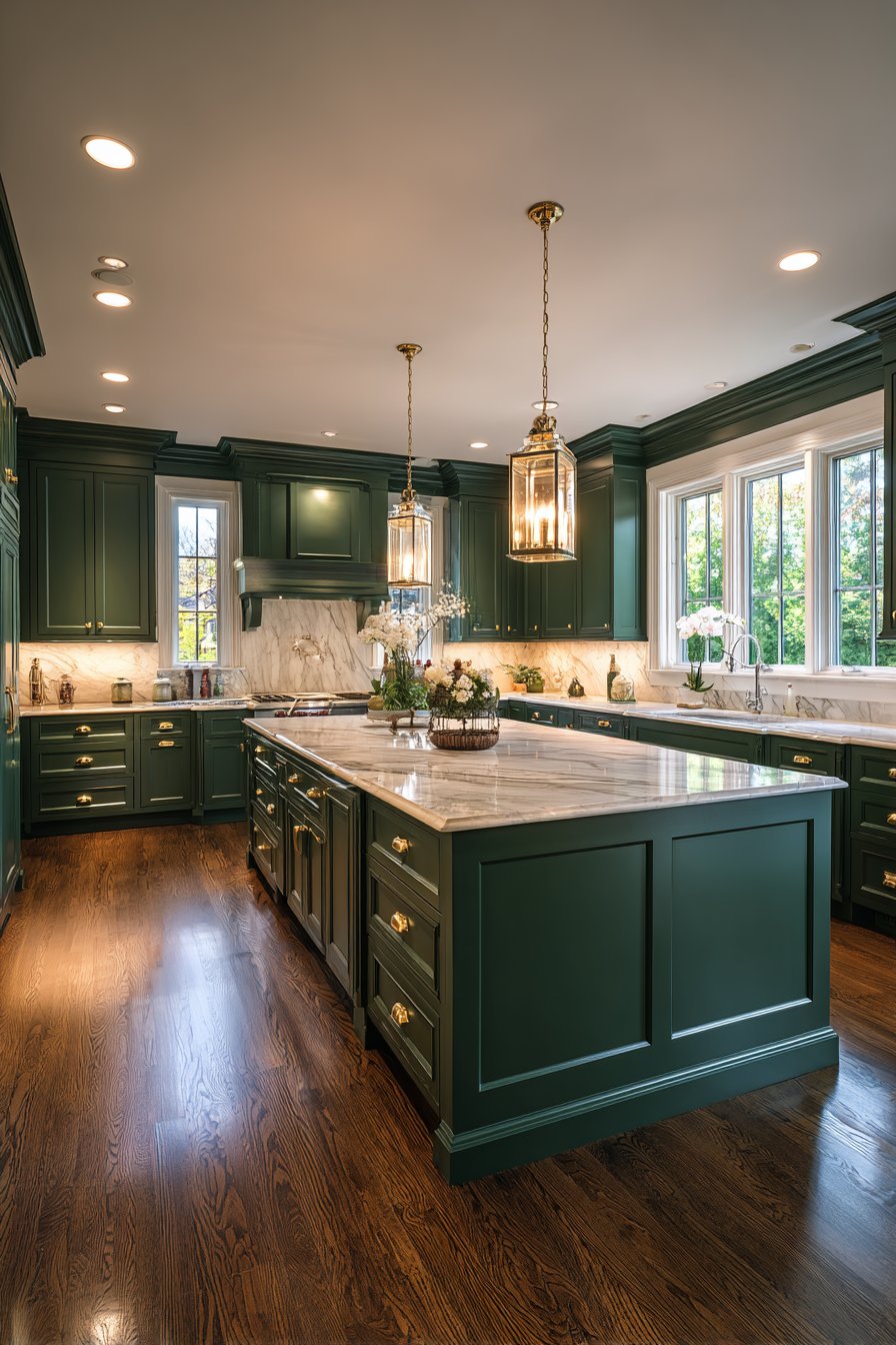 Dark green cabinetry creates architectural interest through shadow and depth that lighter colors cannot achieve. The rich pigmentation highlights cabinet details, moldings, and hardware more effectively than pale alternatives. This dimensional quality makes even simple flat-panel cabinets appear more sophisticated and custom-designed.