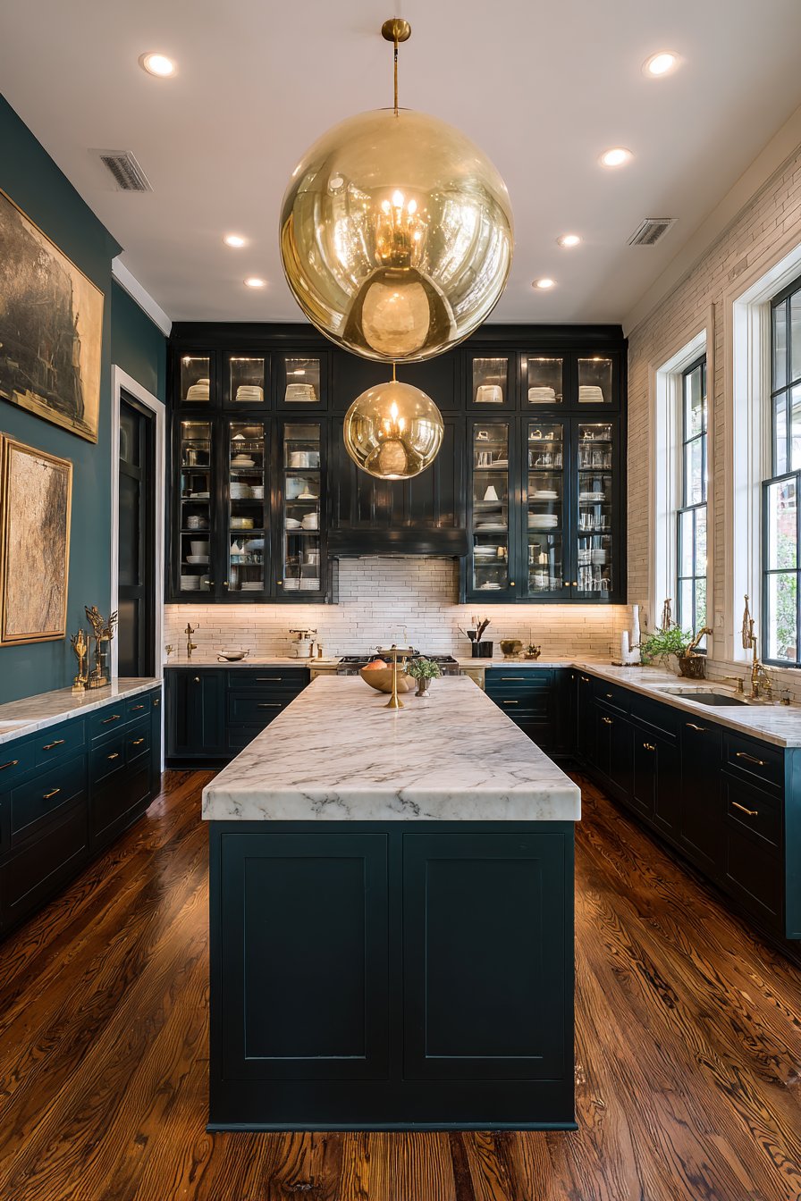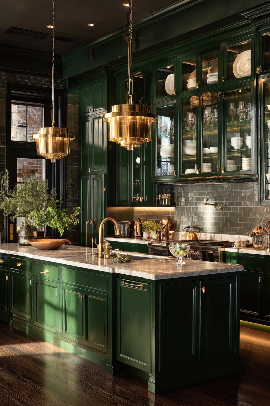 Strategic lighting becomes even more impactful with dark green cabinets. Under-cabinet lights create beautiful contrast, while pendant fixtures cast interesting shadows that enhance architectural features. The depth allows light to become a design element itself, not just a practical necessity.