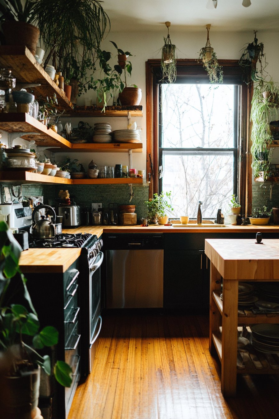 - Incorporate natural wood tones through open shelving or islands
