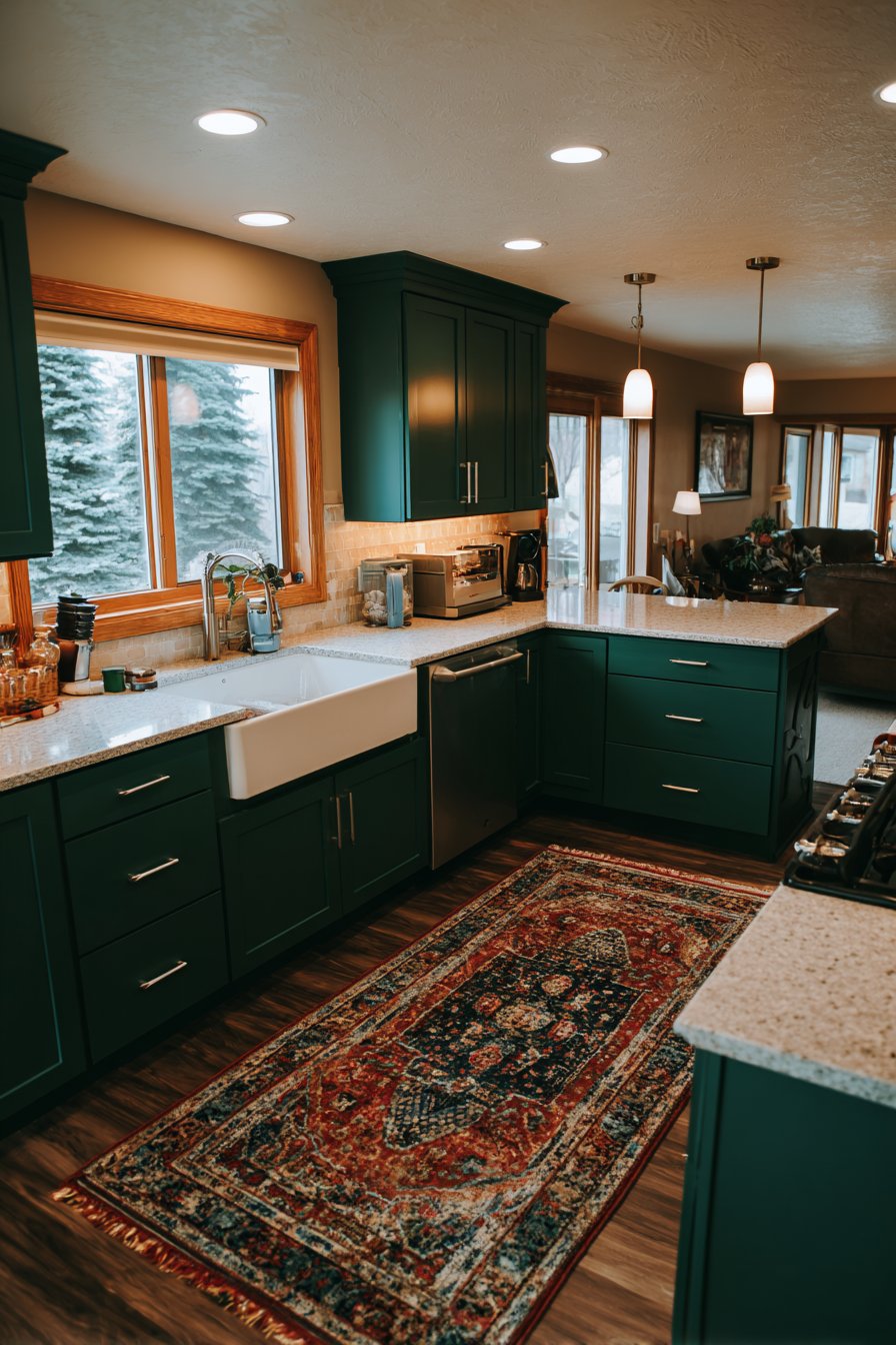 Dark green naturally evokes environmental consciousness and sustainable living principles. This color choice signals appreciation for nature and commitment to timeless design over disposable trends. Homeowners increasingly value kitchens that reflect ecological awareness without sacrificing style or sophistication.