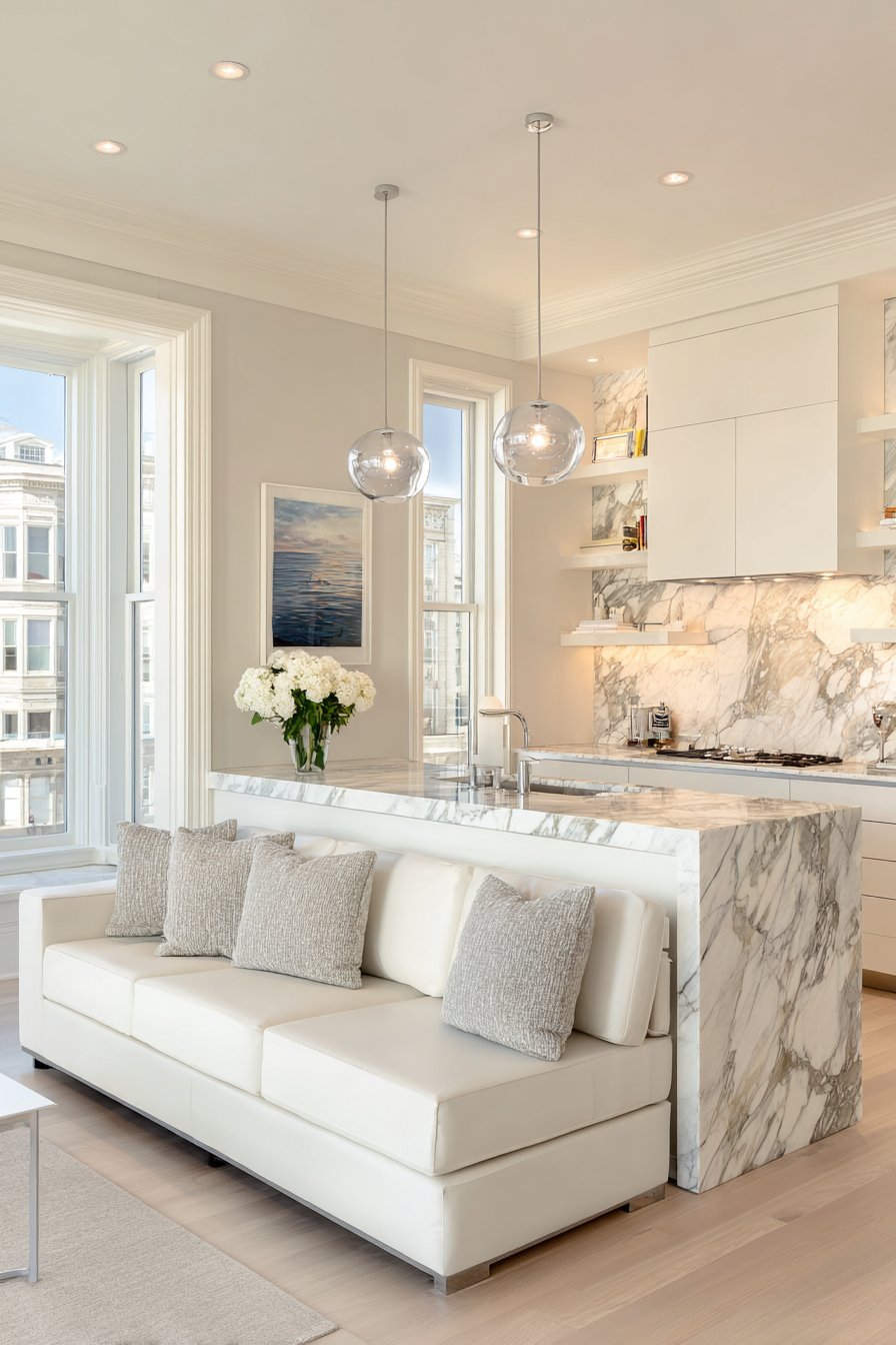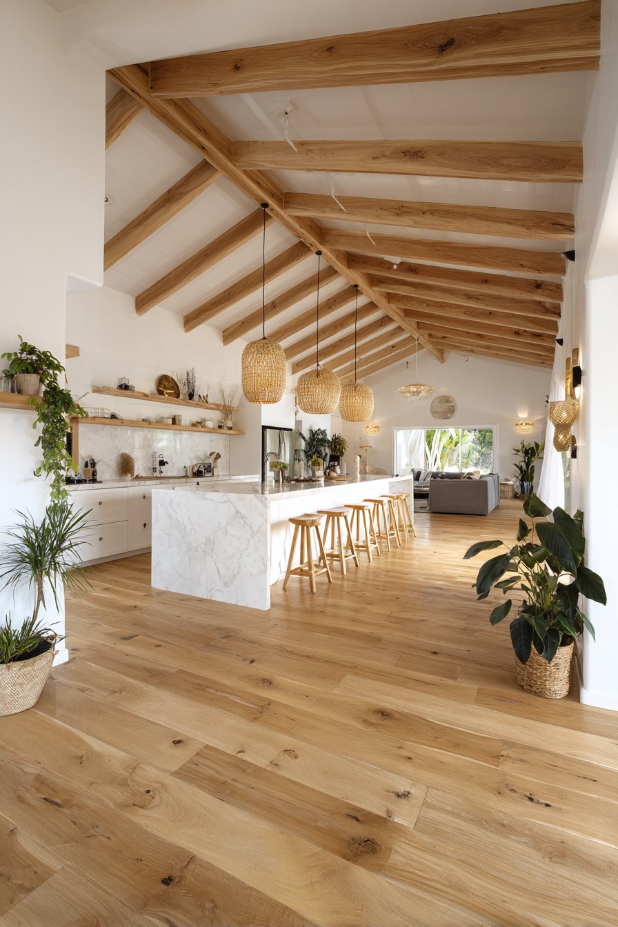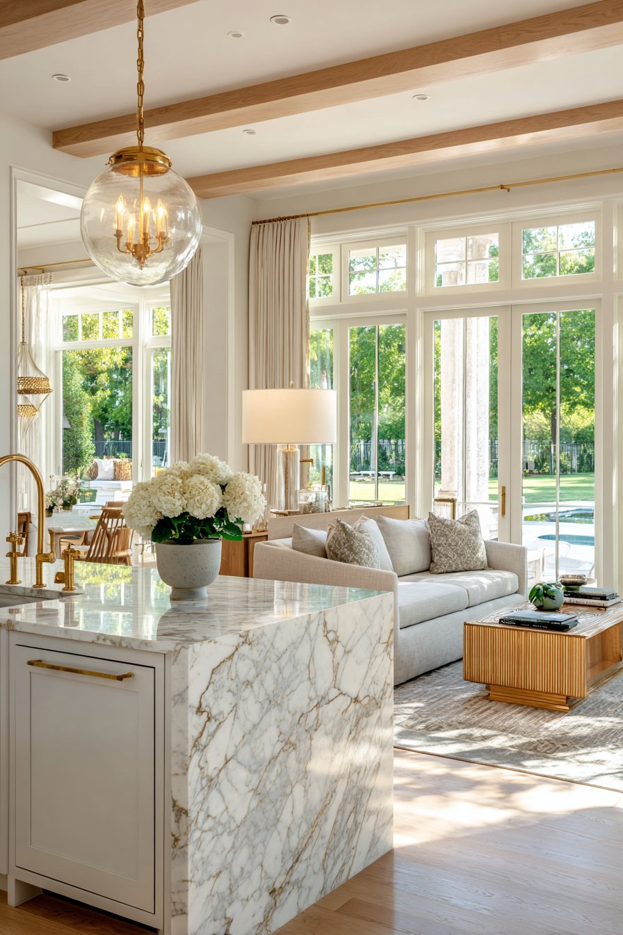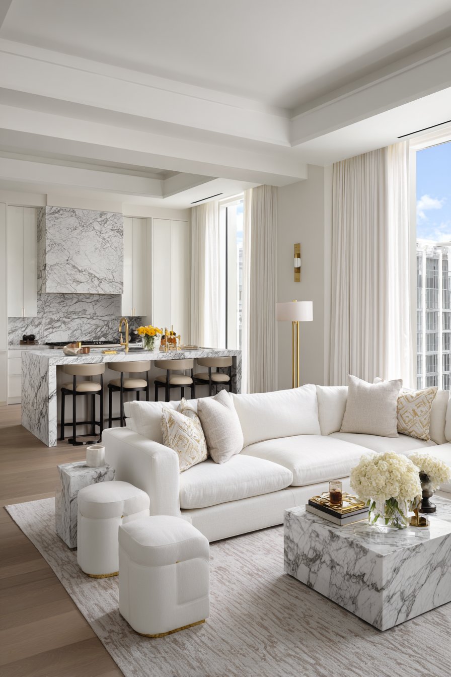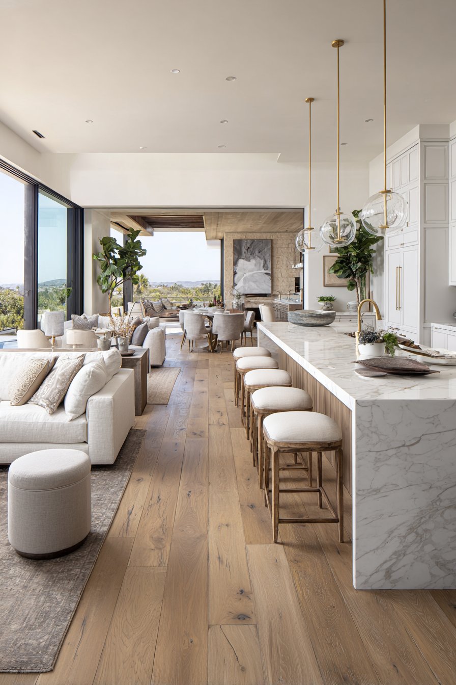 Select three primary materials that appear in multiple locations throughout your open plan. For example, natural wood, white marble, and brushed brass might feature in kitchen cabinetry, dining furniture, and living room accents. This strategic repetition creates a sophisticated layering effect that feels intentional rather than accidental.