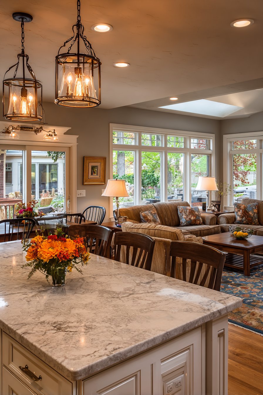 Pendant lights above an island offer prime opportunities to reinforce your home’s aesthetic while providing essential task lighting. Select fixtures whose style echoes nearby table lamps or chandeliers. Under-cabinet lighting illuminates work surfaces without visible fixtures, maintaining clean lines that preserve the open feeling. Dimmers on all circuits allow you to adjust lighting levels to match different activities and times of day.