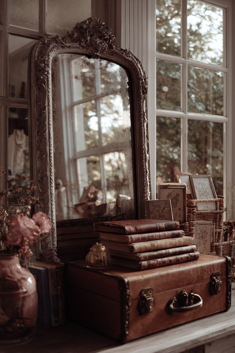 Weathered mirrors in ornate frames reflect light and expand the visual space. Antique toys, vintage books, or porcelain figurines displayed on shelves add nostalgic charm. Woven baskets provide functional storage while contributing to the rustic aesthetic. Each carefully chosen piece should serve a purpose or bring genuine joy.