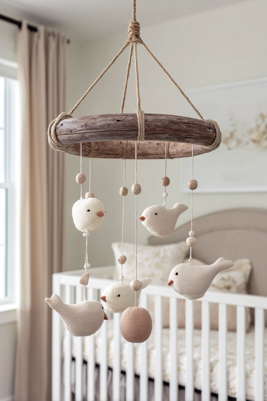A handmade mobile hangs above the crib crafted from natural linen fabric birds. Soft neutral tones create a gentle color palette overhead. The birds suspend from a weathered wooden hoop with jute cord. The mobile sways gently in natural light from nearby windows.