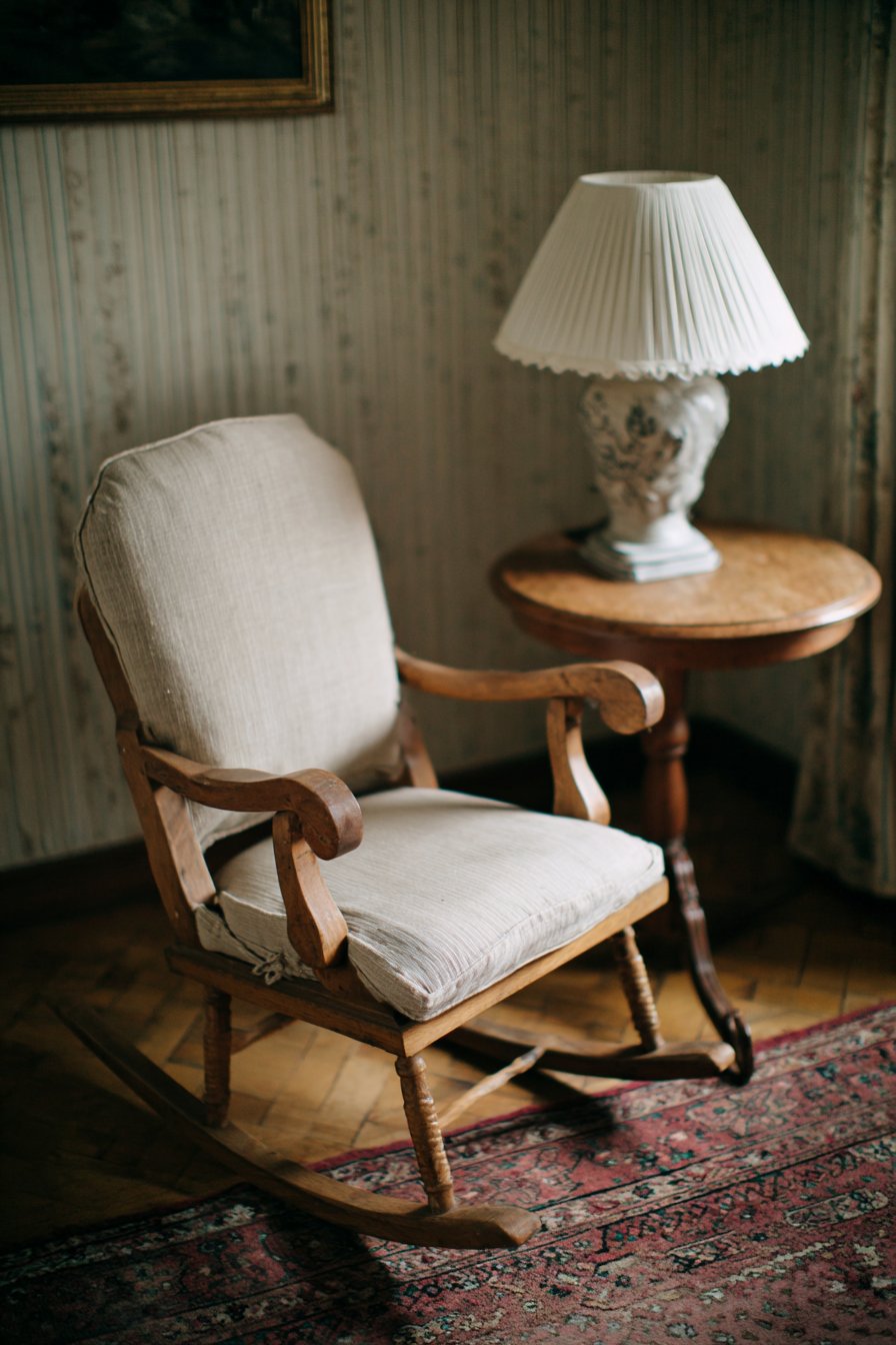 A weathered wooden rocking chair sits nearby with faded floral cushions that tell stories of gentle use. An antique side table displays a ceramic lamp crowned with a linen shade. The lived-in elegance feels genuine and welcoming. Every element speaks to comfort and timeless beauty.