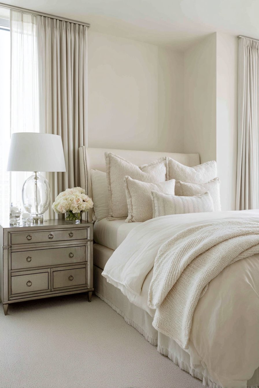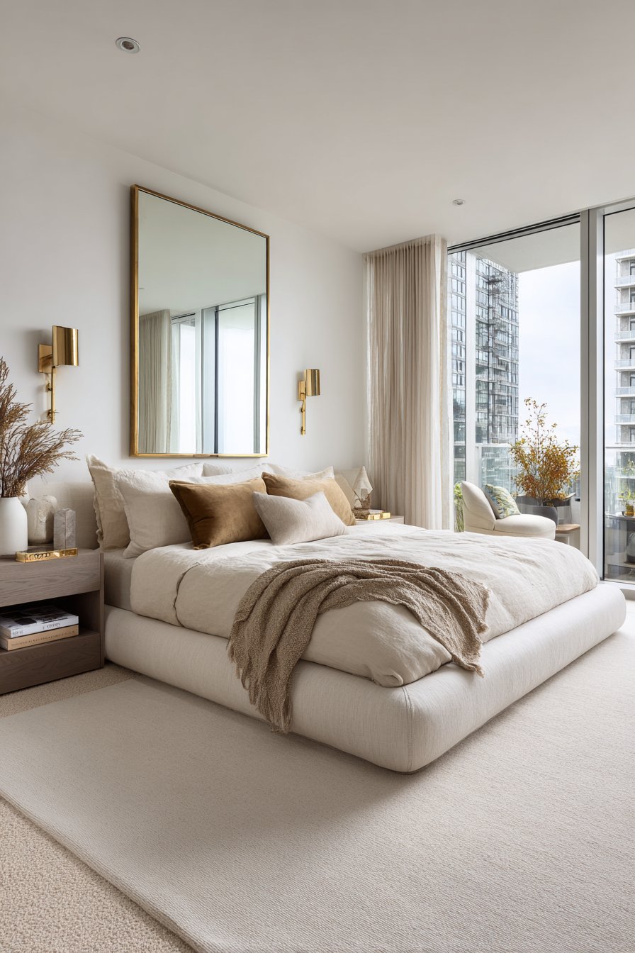 Mirrors placed opposite windows amplify natural light and create depth through reflection. A large mirror can literally double the visual space in your bedroom. Consider mirrored furniture pieces like nightstands or dressers to enhance this effect without adding obvious mirrors that might feel dated.