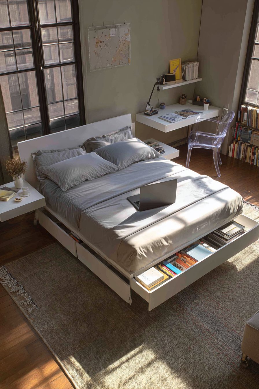 - Invest in a platform bed with underneath storage compartments