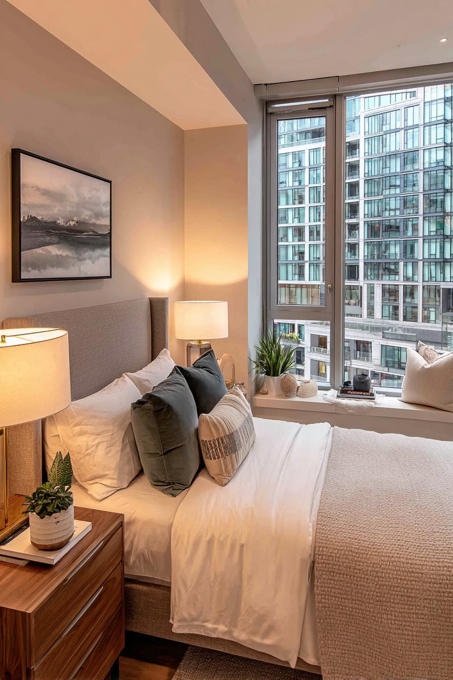 Artificial lighting should be layered to eliminate dark corners that make rooms feel smaller. Combine overhead fixtures with task lighting and accent lights for comprehensive coverage. Wall-sconces free up valuable nightstand space while providing essential reading light. Uplighting directs attention toward the ceiling, creating the perception of vertical expansion.