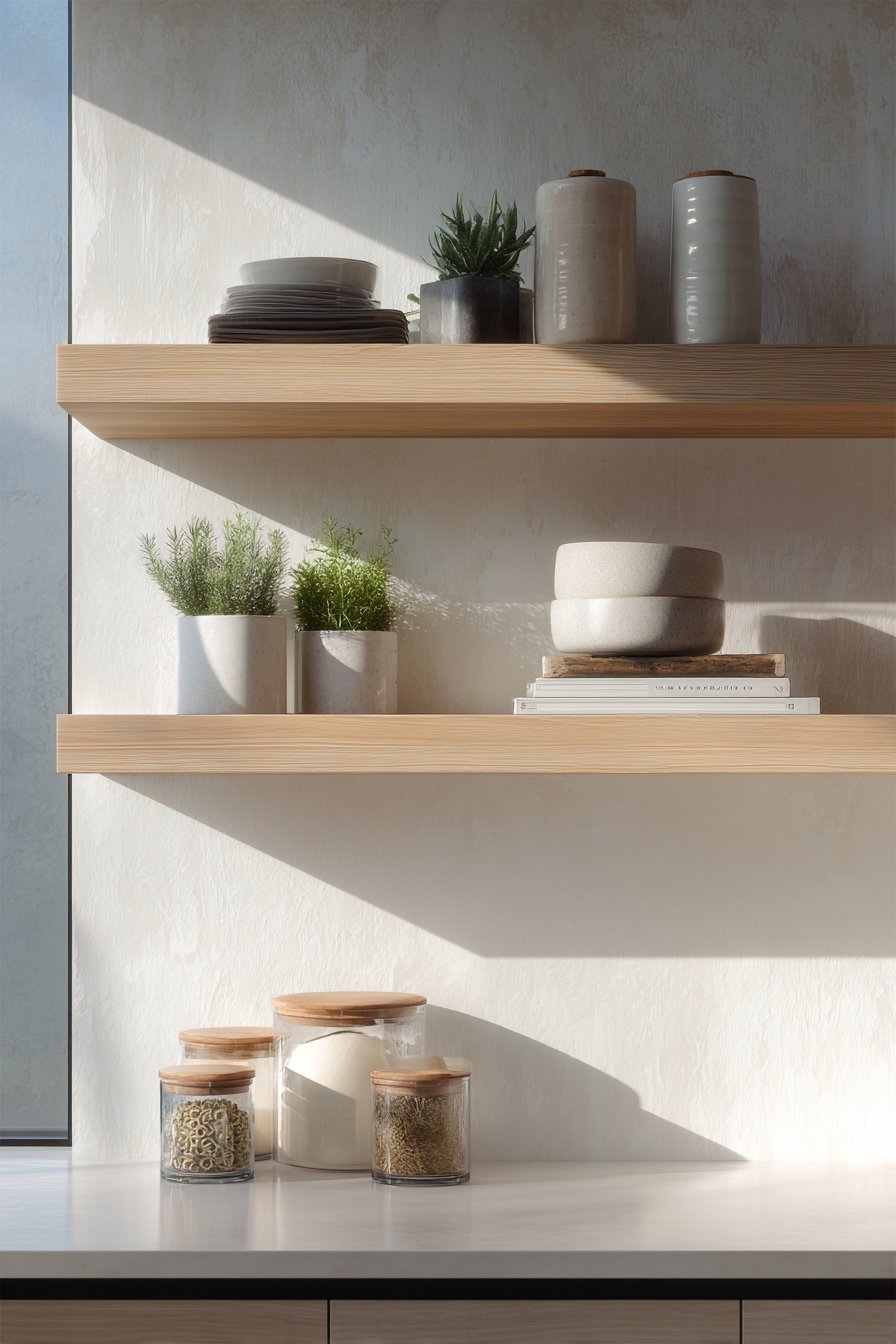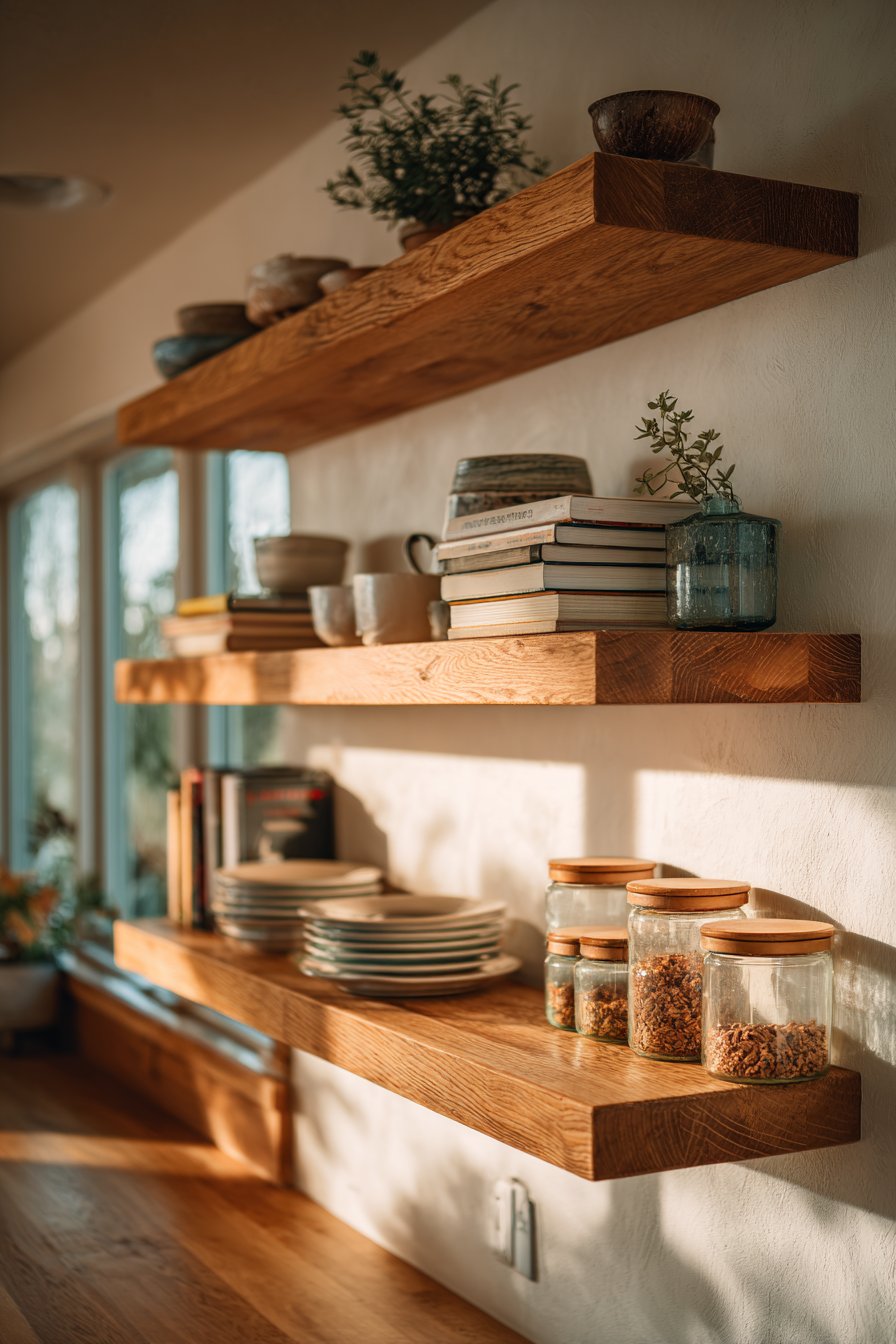 Floating shelves offer the perfect balance between decorative display and functional storage. They create opportunities to showcase beautiful dishware, cookbooks, and decorative objects while keeping frequently used items accessible. This styling choice works particularly well in smaller kitchens where traditional upper cabinets might feel oppressive.