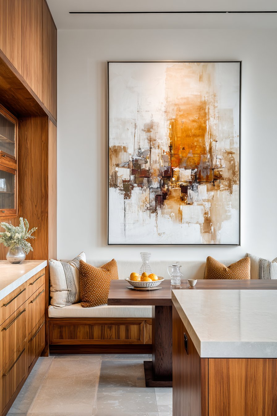 A single oversized artwork creates immediate impact and serves as the room’s visual anchor. This approach suits homeowners who prefer streamlined, uncluttered aesthetics over eclectic gallery walls. The right piece can establish your kitchen’s entire color palette and set the emotional tone for the space.