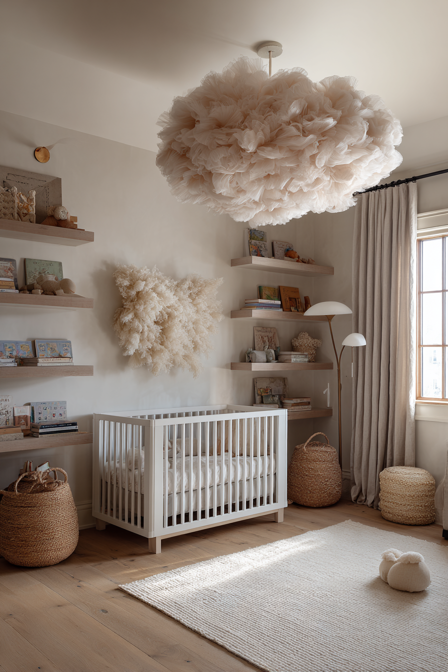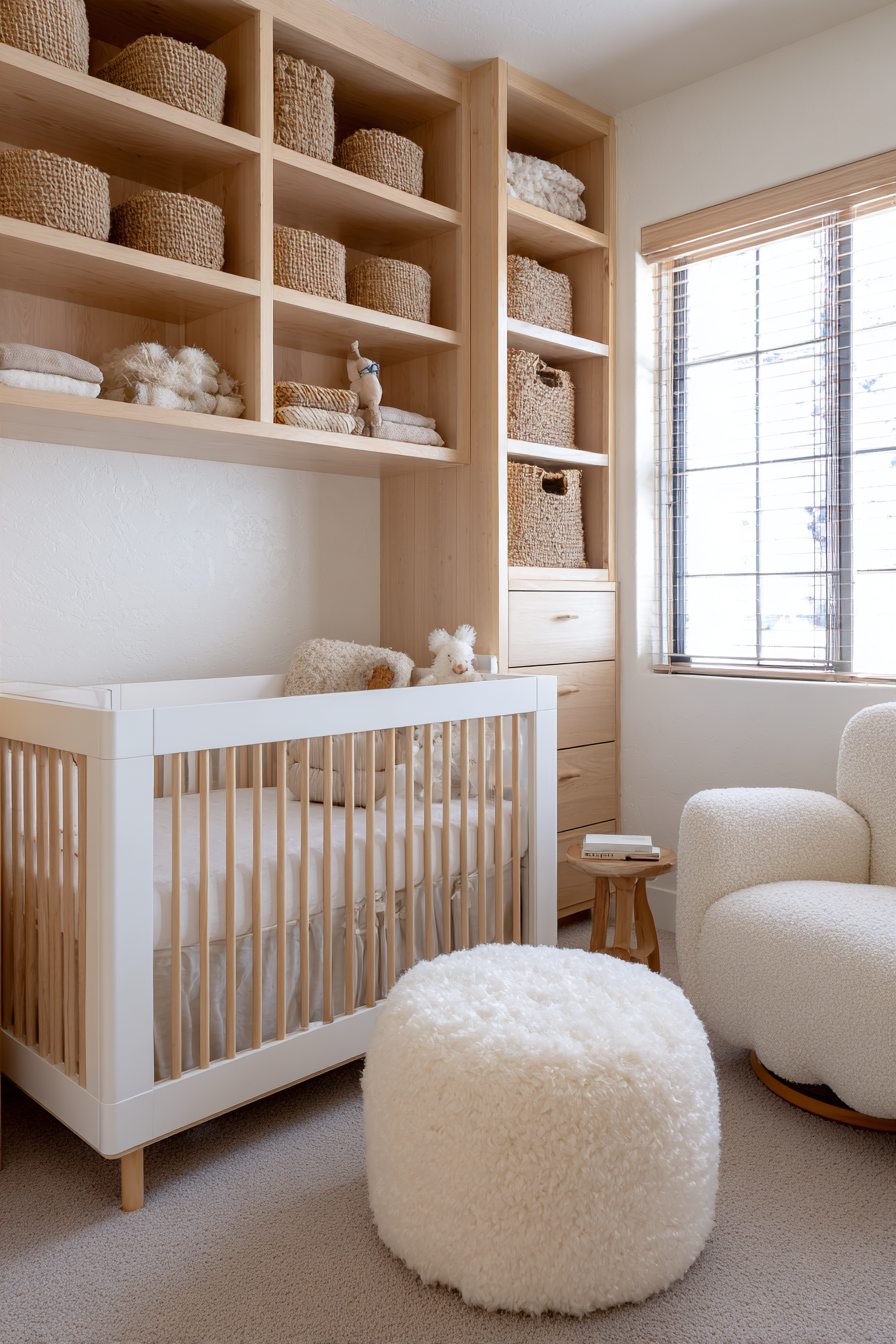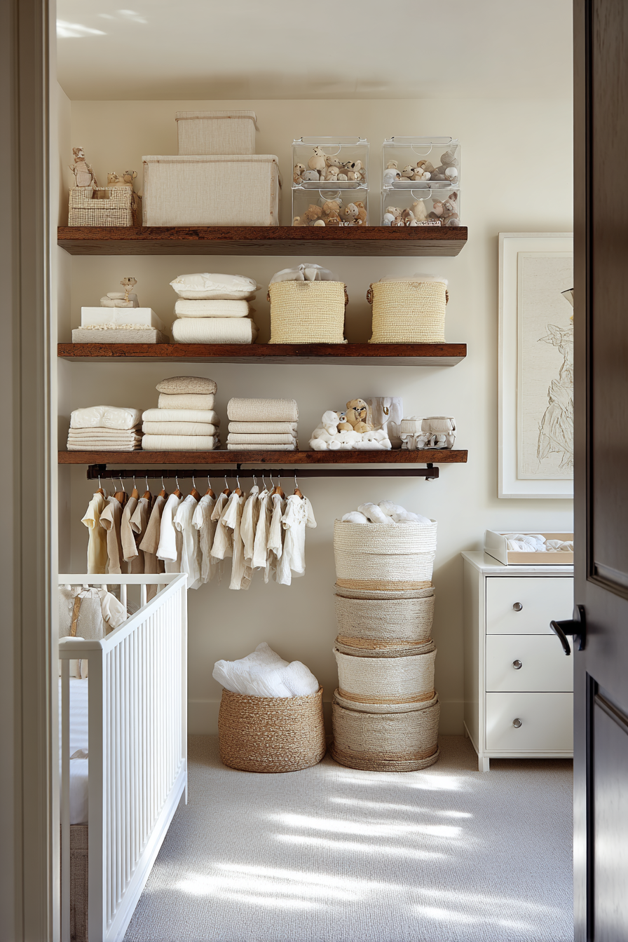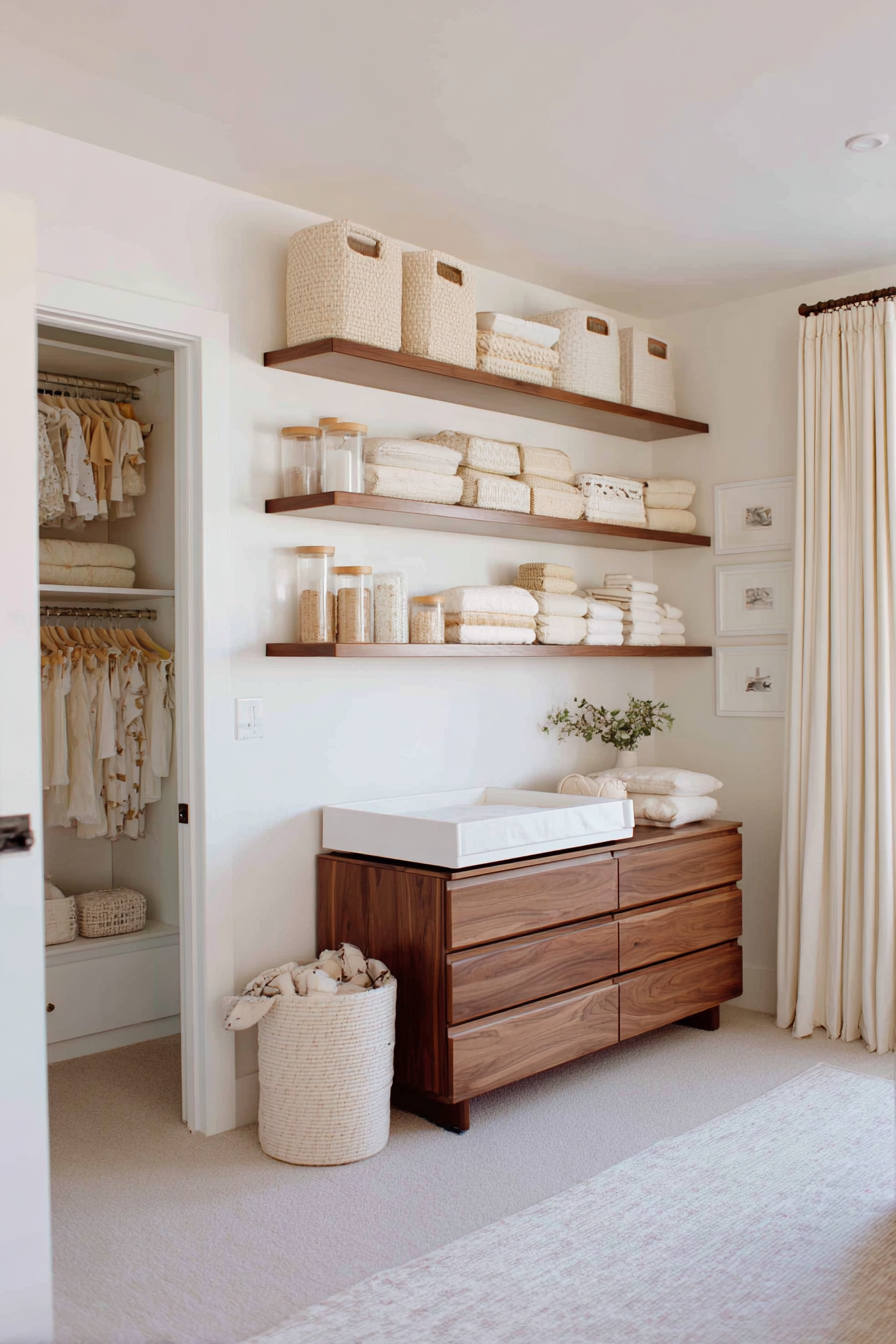 Organized spaces automatically appear more luxurious and intentional than cluttered rooms. Creative storage solutions keep baby essentials accessible while maintaining clean visual lines. Vertical space often goes unused despite offering the most cost-effective storage expansion.