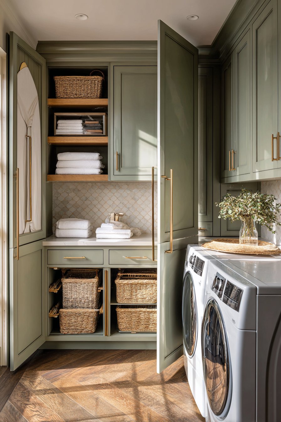 No luxury laundry room is complete without intelligent storage solutions. Clutter is the enemy of elegance, and in a laundry space, clutter accumulates quickly — detergent bottles, dryer sheets, lint rollers, and stain removers can easily overtake a room. Custom cabinetry solves this problem with precision and style.