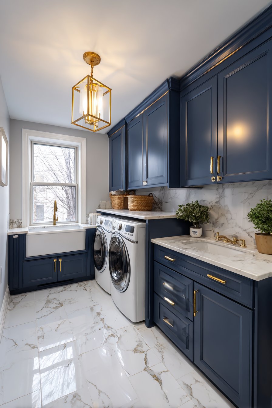 A statement pendant light or small chandelier above the sink or folding area adds a decorative focal point that signals luxury intentionality. Even in a utility space, this kind of design choice transforms the room from purely functional to genuinely beautiful. Warm white LED bulbs (2700–3000K) create a flattering, welcoming ambiance.