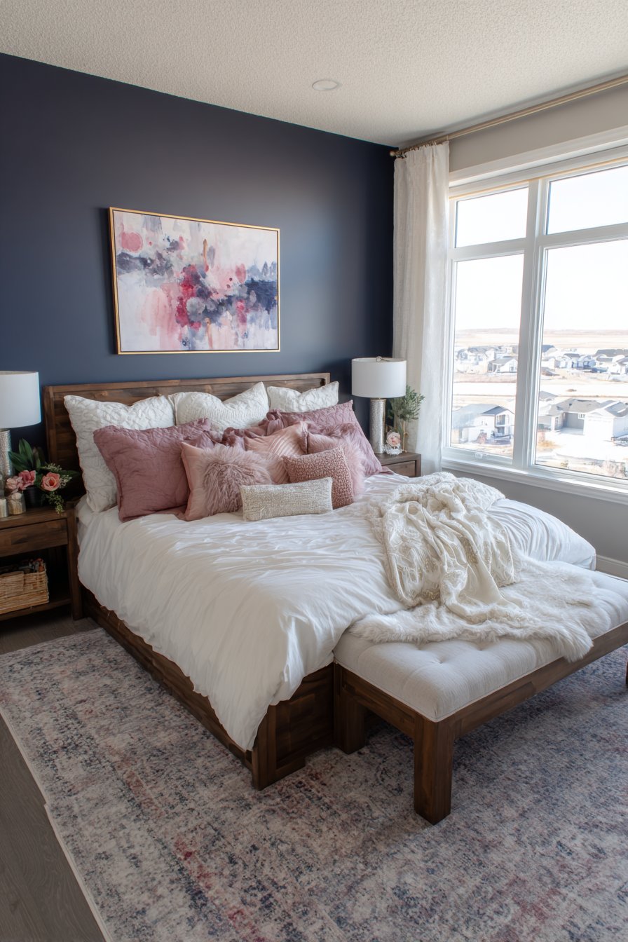 The contrast between these colors also enhances architectural features. Navy might emphasize crown molding while pink draws attention to a beautiful headboard. This technique helps showcase your room’s best attributes without expensive renovations.
