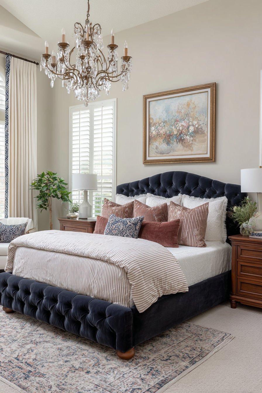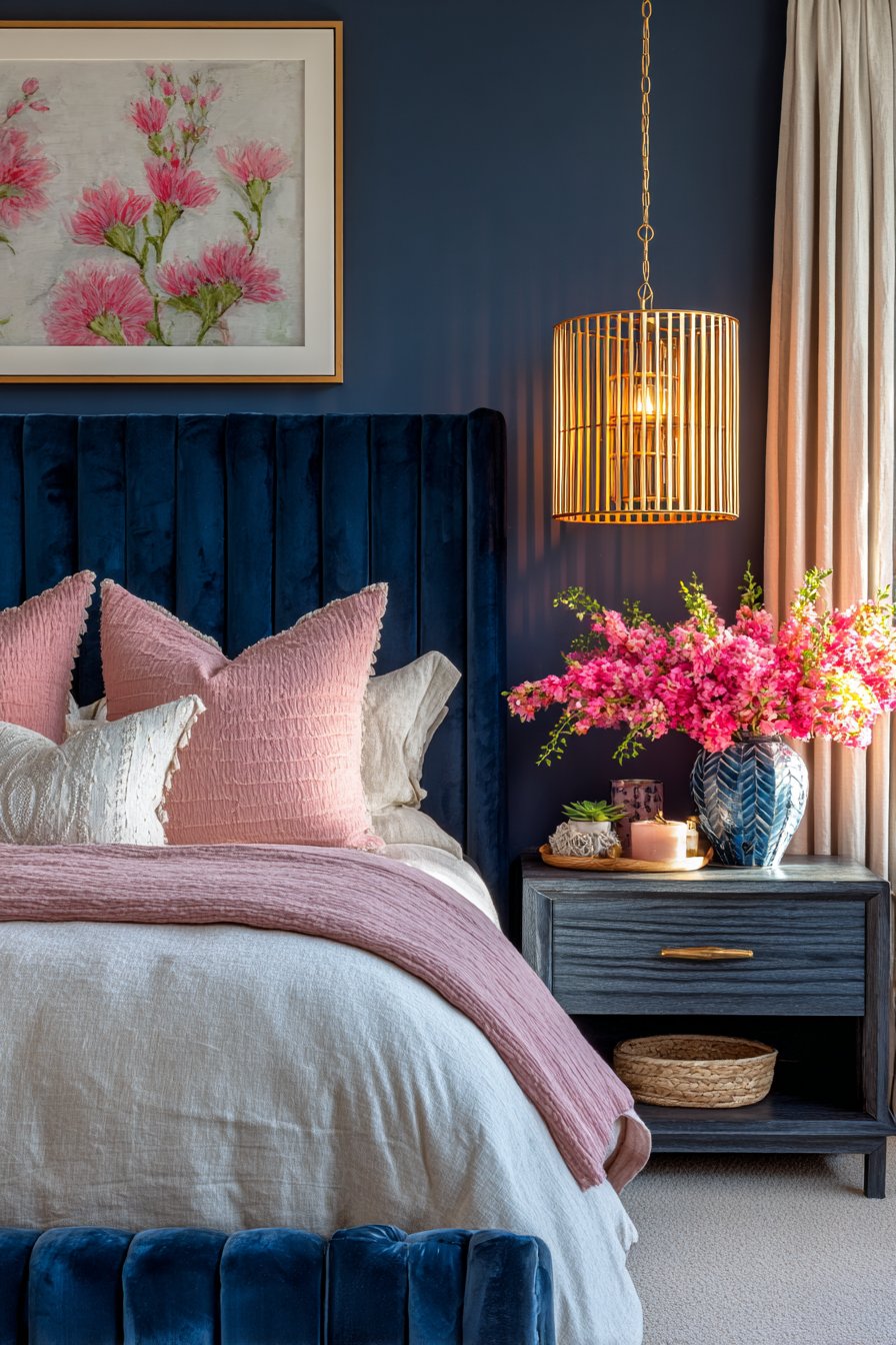 Traditional rooms benefit from this pairing through rich fabrics and textures. Velvet navy headboards combined with pink silk or satin bedding evoke classic elegance. The combination feels timeless rather than dated, offering longevity in design investment.