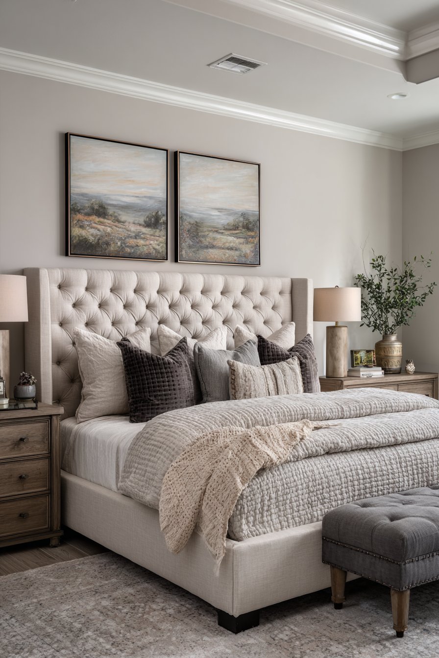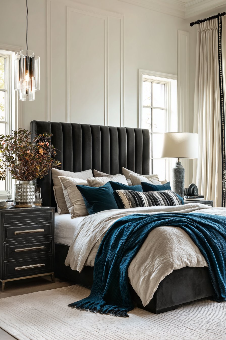 - Use a bold upholstered headboard against neutral walls for impact