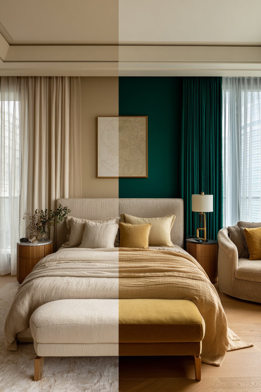 You don’t have to choose exclusively between neutral and bold approaches. The most sophisticated bedrooms often blend both strategies for dynamic yet balanced results. This hybrid approach allows you to enjoy the calm foundation of neutrals while expressing personality through strategic bold accents. It’s an ideal solution for those who appreciate both aesthetics.