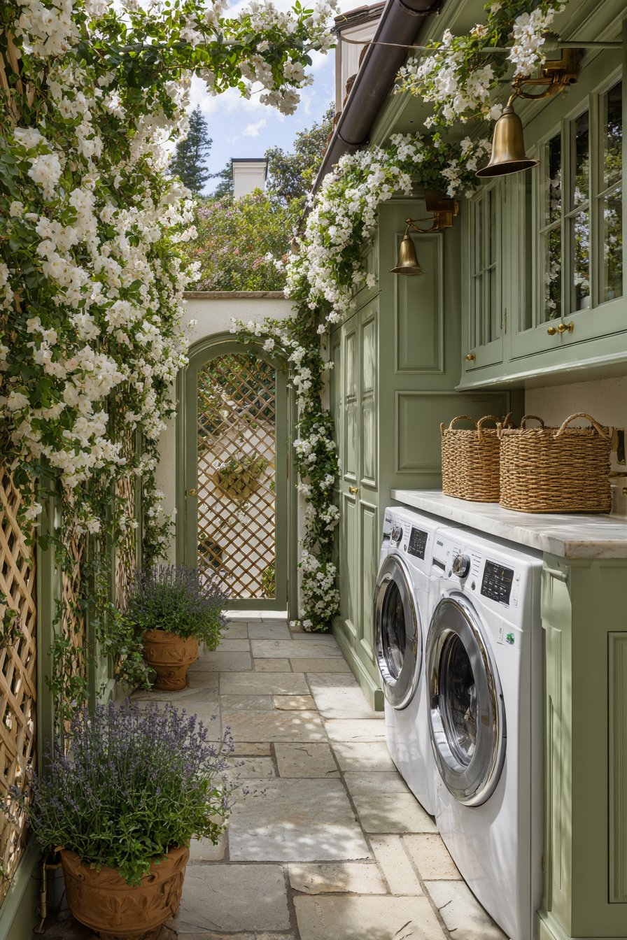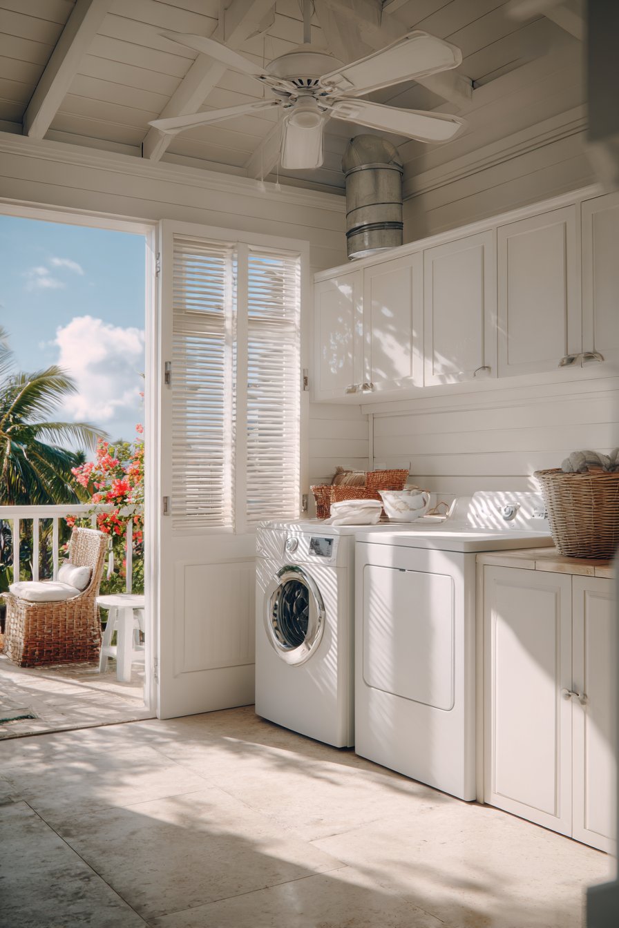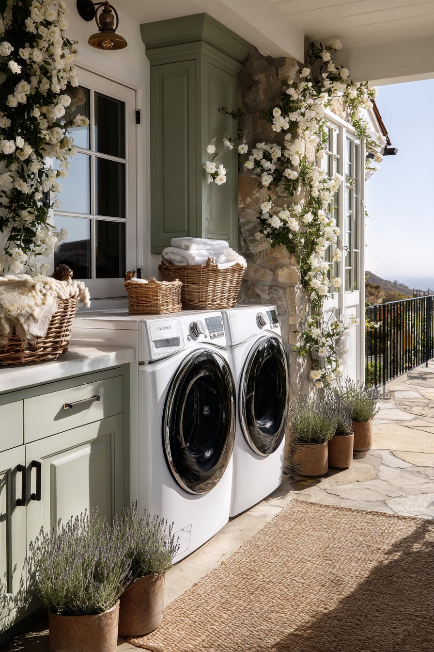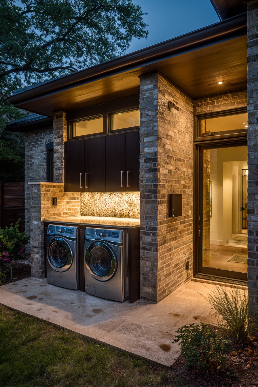 The aesthetic design of the space should also complement your home’s exterior. Choose cabinet colors, countertop materials, and decorative elements that match or coordinate with your house’s architectural style. Even simple details like matching hardware finishes, a coordinated color palette, and adding a few potted plants can transform a utilitarian outdoor laundry station into a beautiful and functional extension of your home.