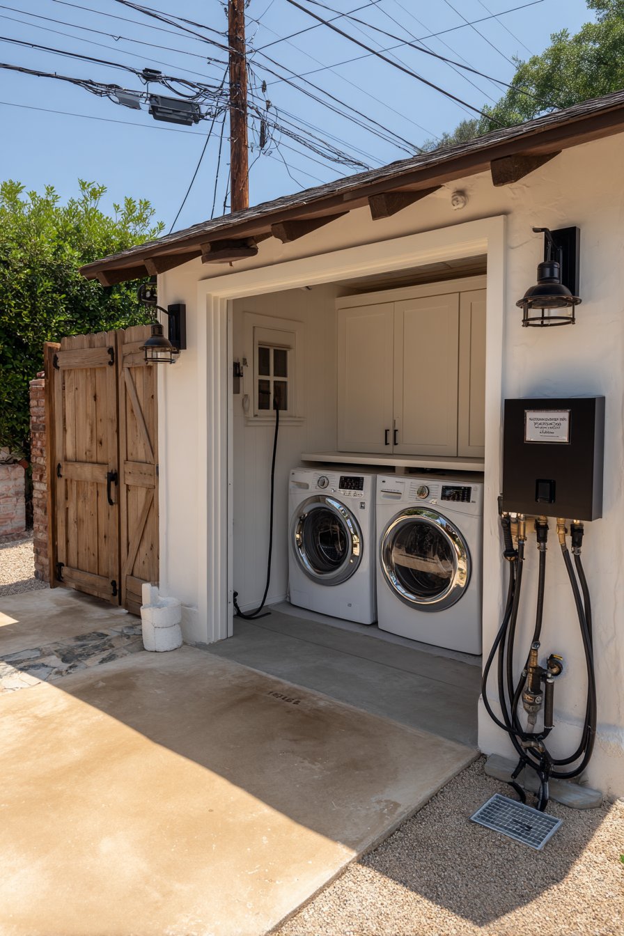 Outdoor laundry rooms demand the same electrical and plumbing infrastructure as indoor ones — but with additional safety requirements for exterior environments. Skimping on this infrastructure is one of the most dangerous and expensive mistakes you can make. Electrical connections exposed to moisture without proper protection create serious shock and fire hazards.