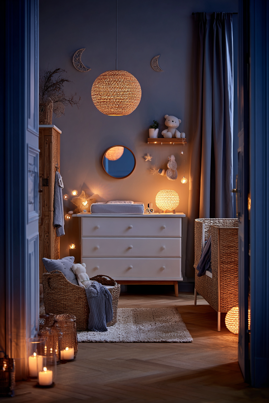 Blue nurseries benefit from warm-toned lighting that prevents the space from feeling cold or clinical. Choose bulbs with 2700-3000K color temperature to add welcoming warmth. Install dimmer switches to adjust brightness for nighttime feedings and diaper changes without harsh overhead lights.