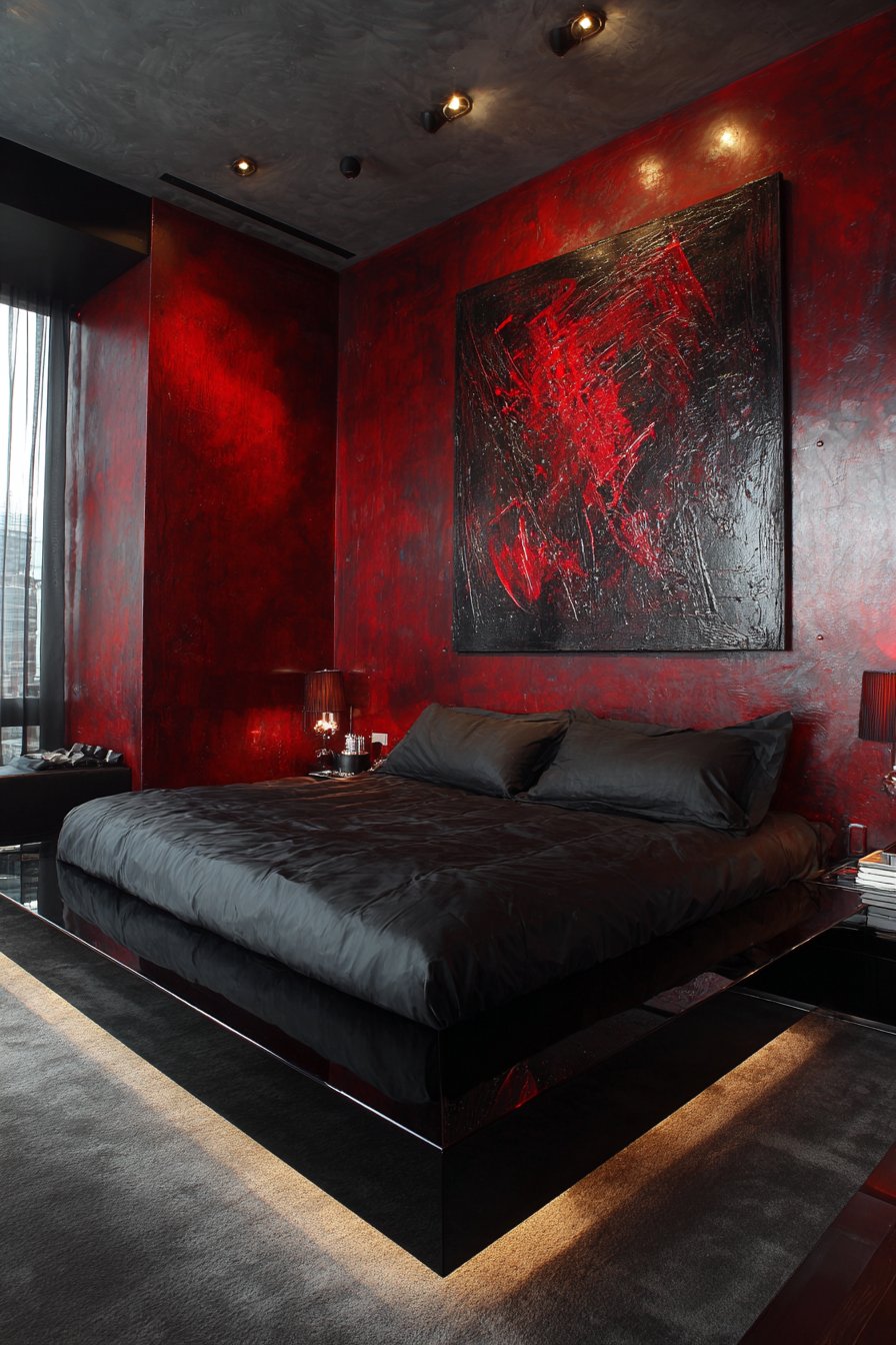 Deep crimson silk and black satin create an opulent sleeping environment. A black upholstered platform bed with tufted headboard anchors the space. The bedding layers include rich red silk duvet and black satin sheets. Burgundy velvet throw blanket adds textural depth.