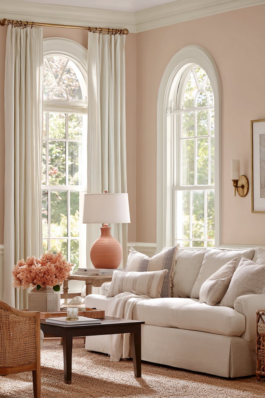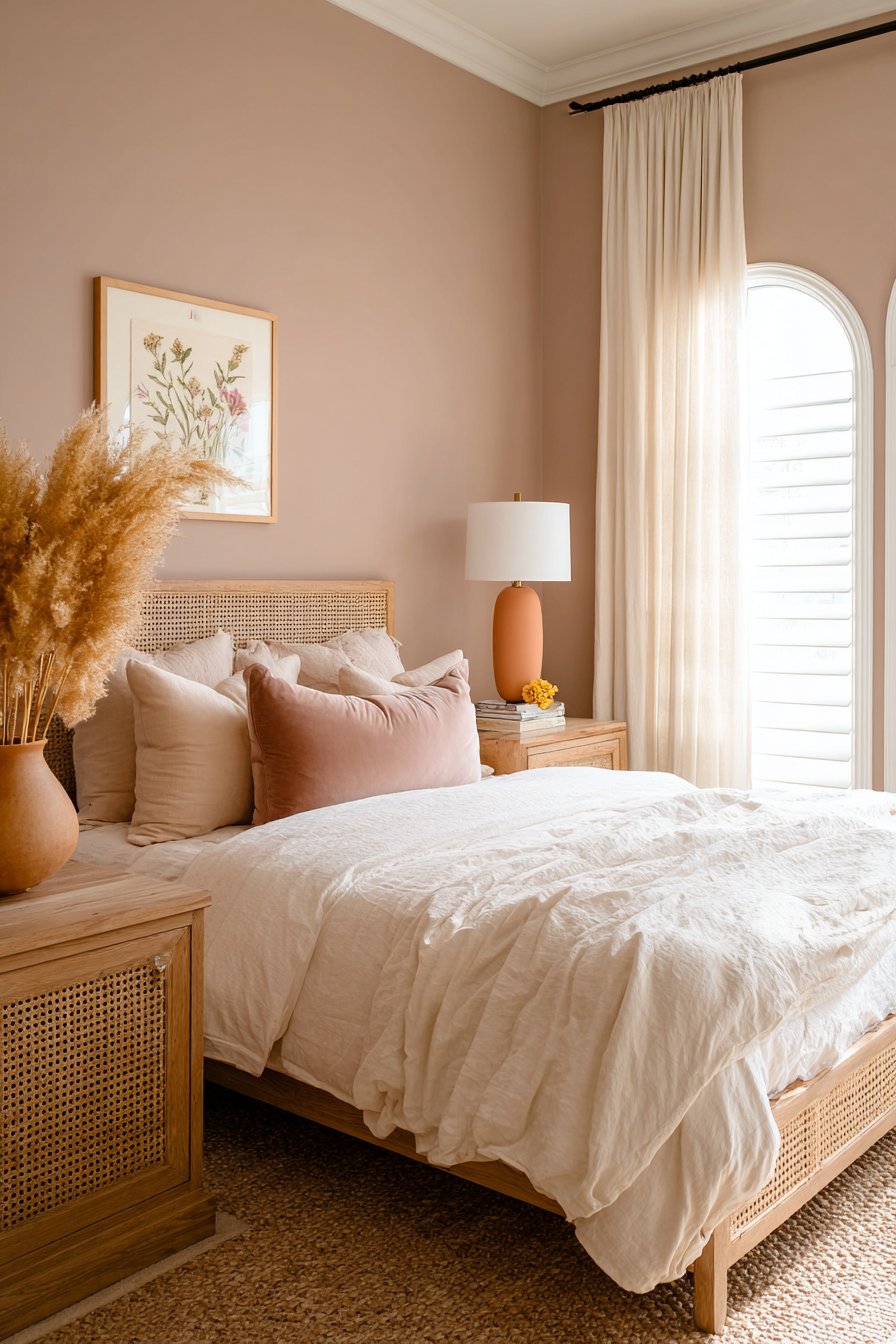 - Introduce blush through linen cushions, throws, and bedside lampshades